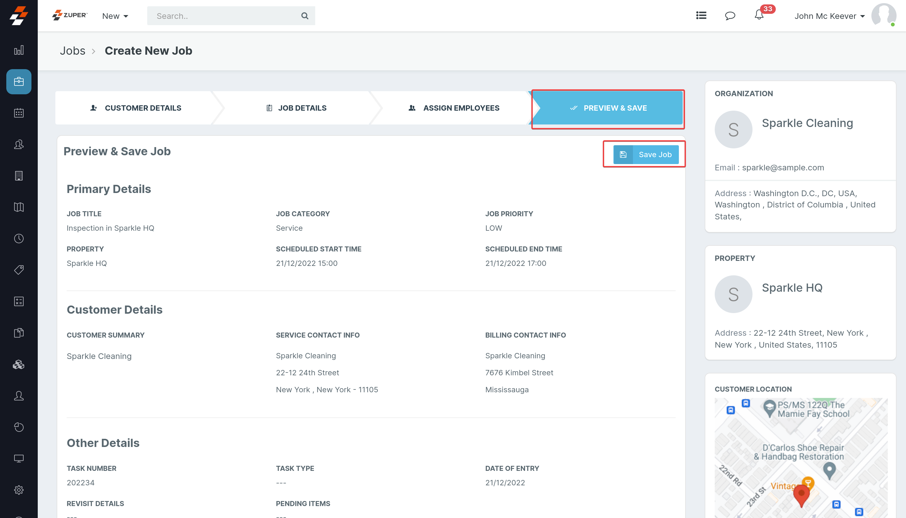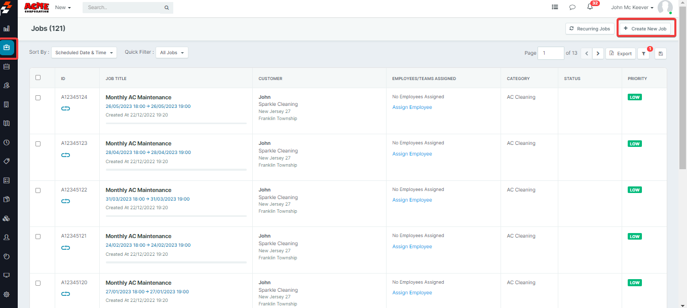 1. Select the Jobs module from the left panel and Navigate to the + Create New Job to create a new job.