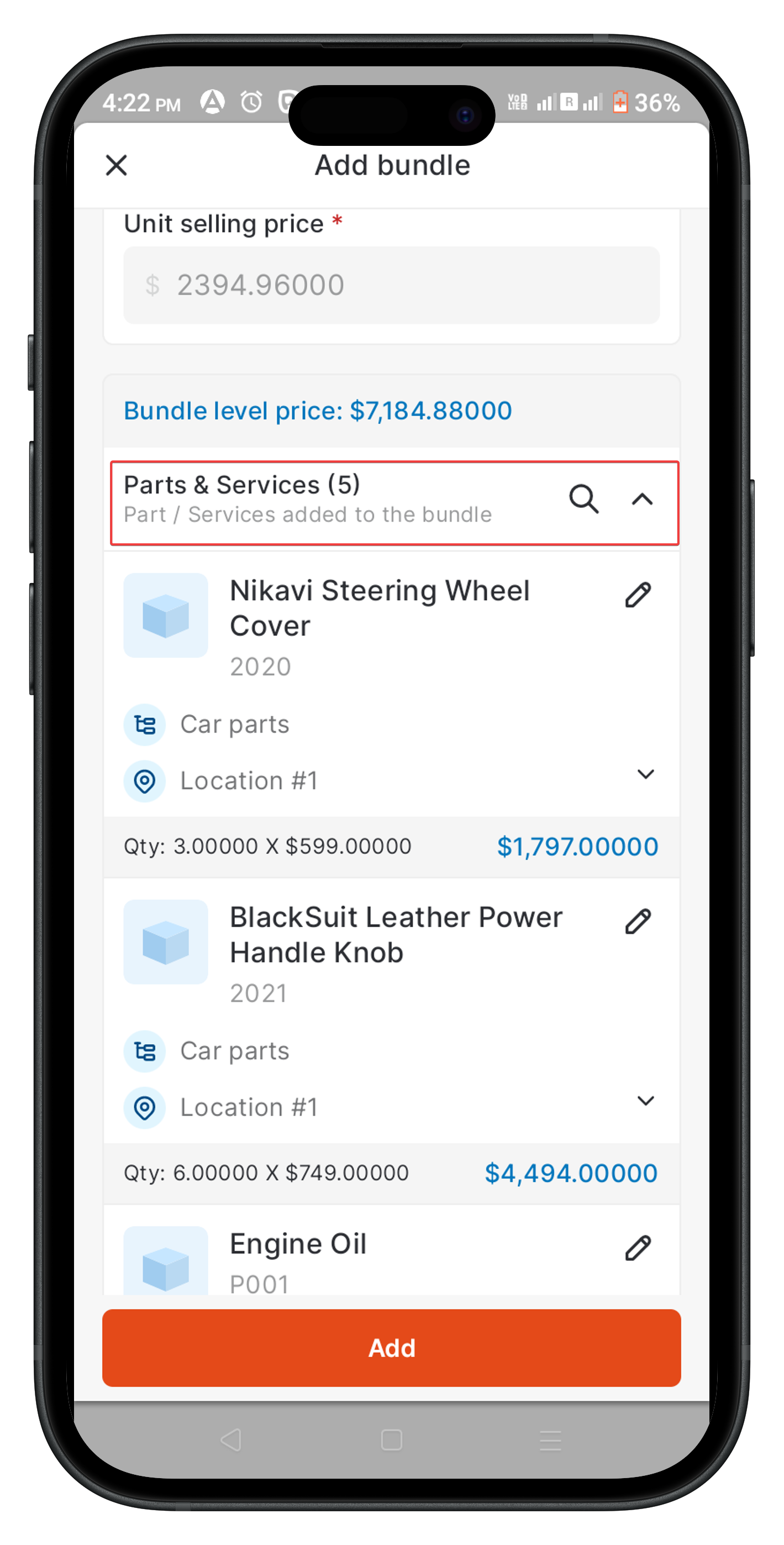 In the Parts & Services listing page, product bundles are marked with a “Bundle Item” caption on their card, allowing for easy identification. - How can I differentiate between bundle-level and roll-up item bundles?