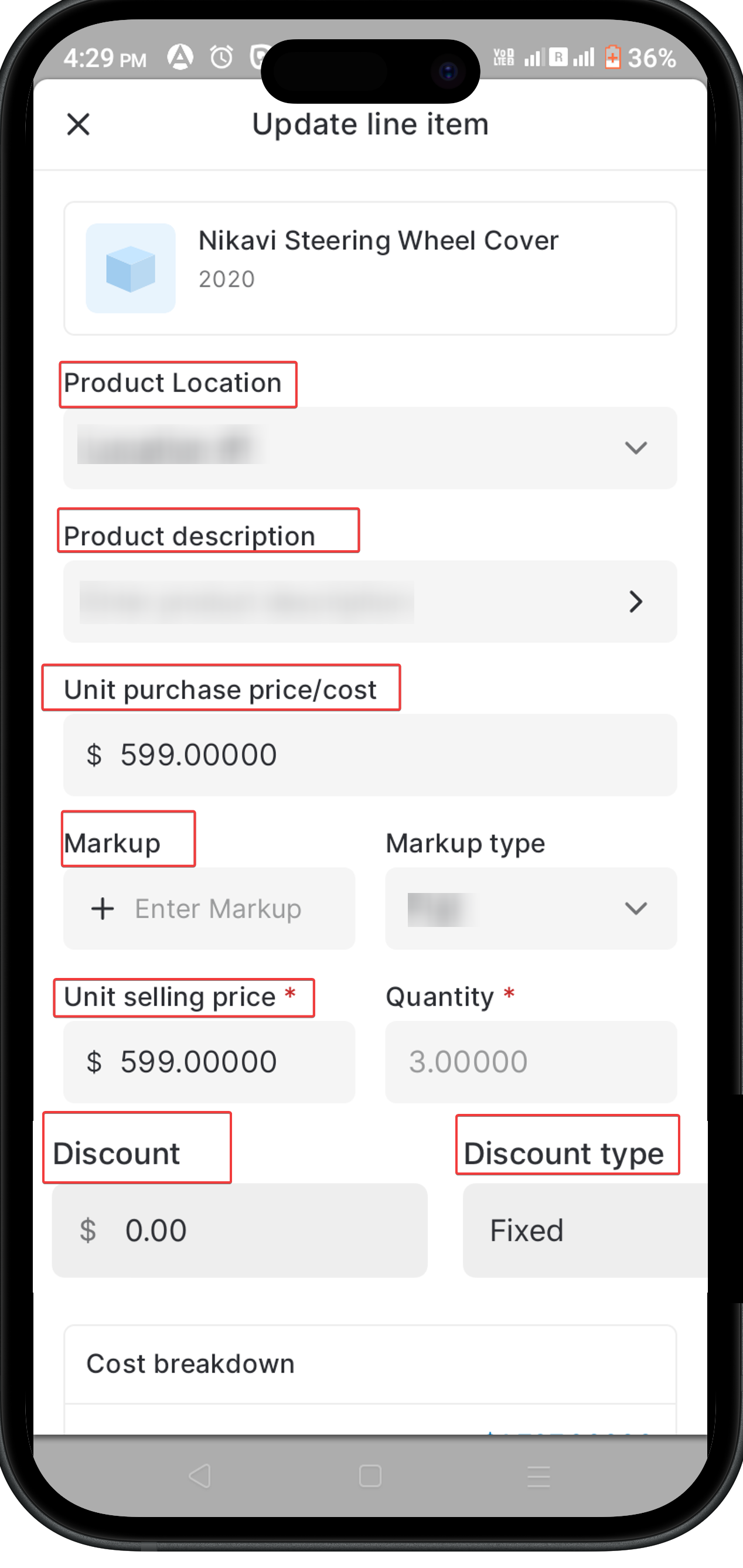 - Discount and Discount Type: Apply any discount on the item. Choose between fixed or percentage discount types.