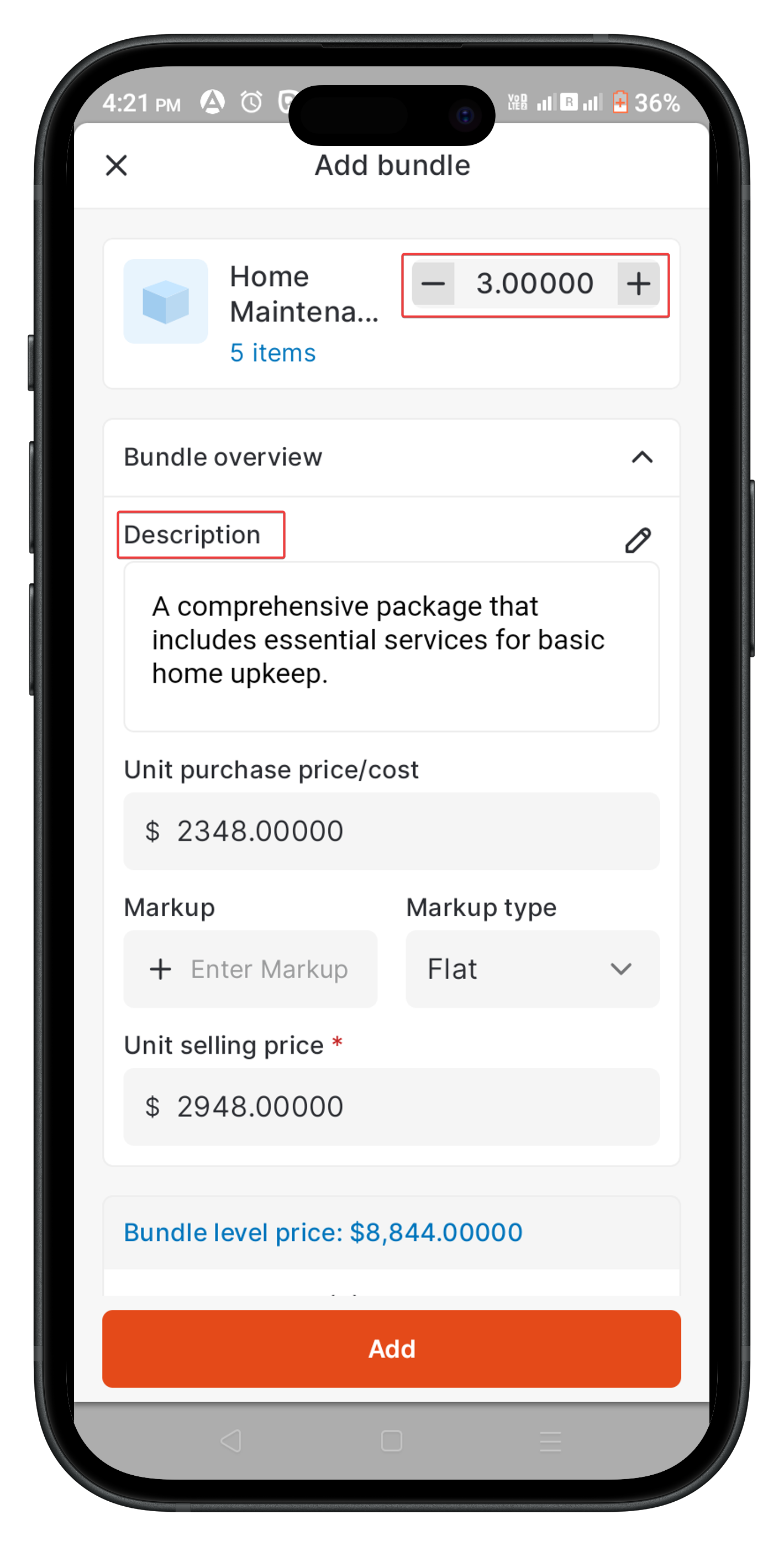 Note: For the Bundle level price, you cannot modify the sub-item details, but you can apply a markup at the bundle price level.