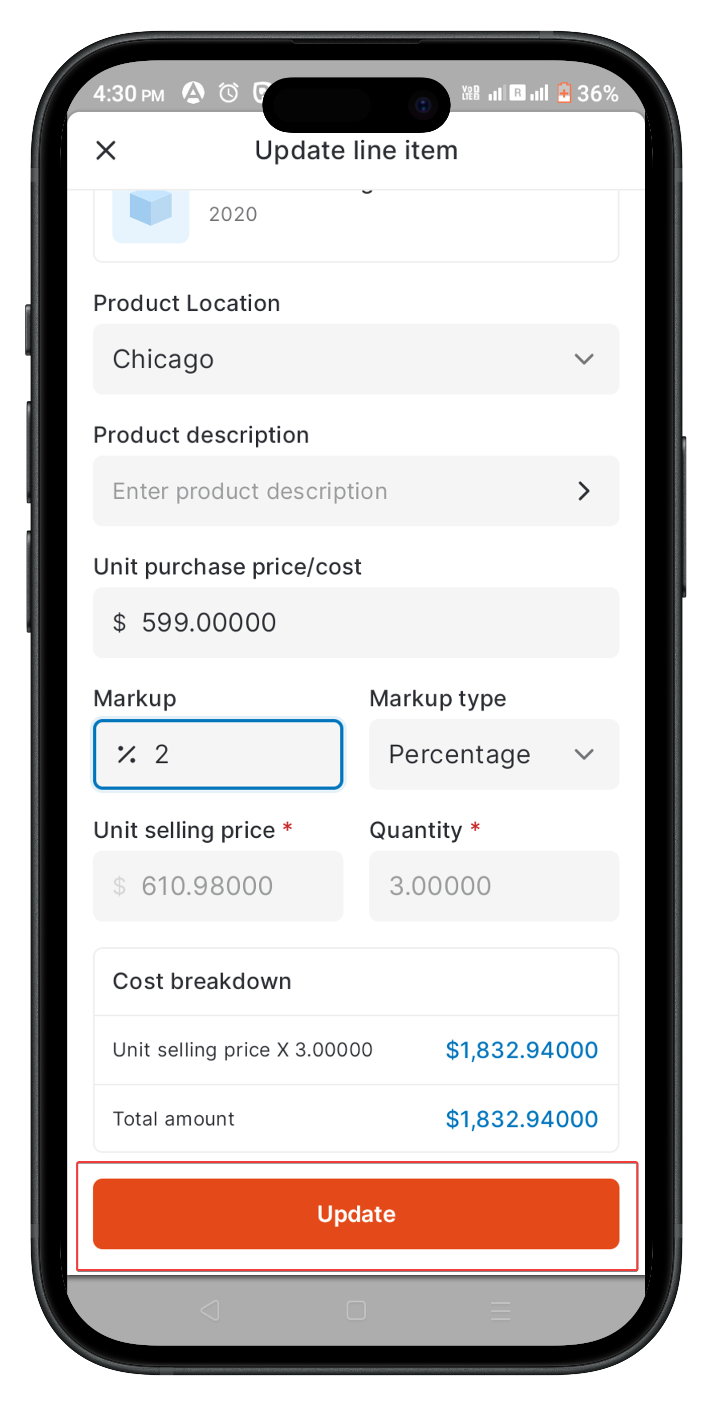 11. After editing, tap "Update" to save changes for each line item within the bundle.