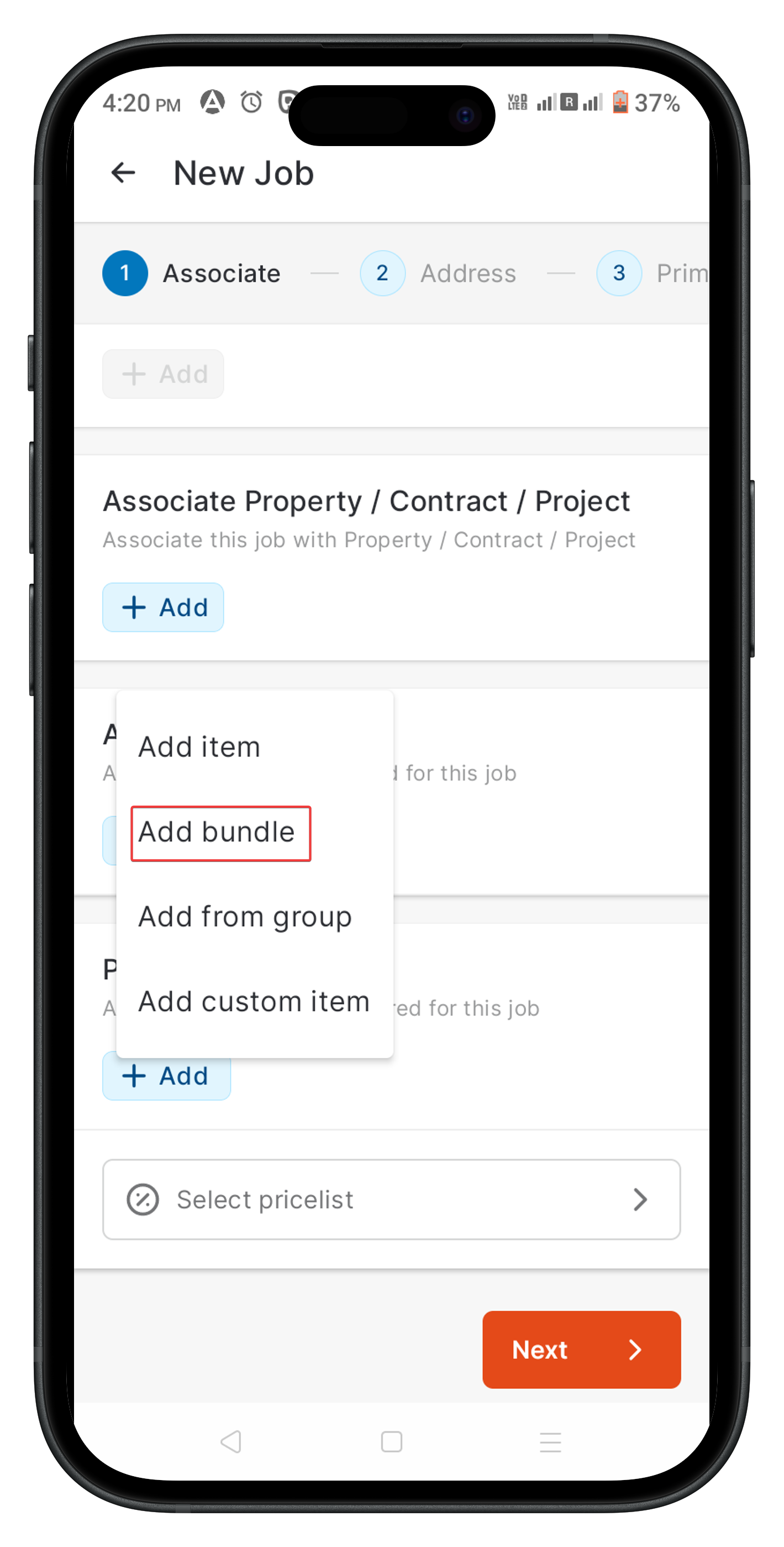 To add a product bundle to a transaction in the Zuper Mobile App, follow these steps when working on a Quote, Invoice, Proposal, or Job: