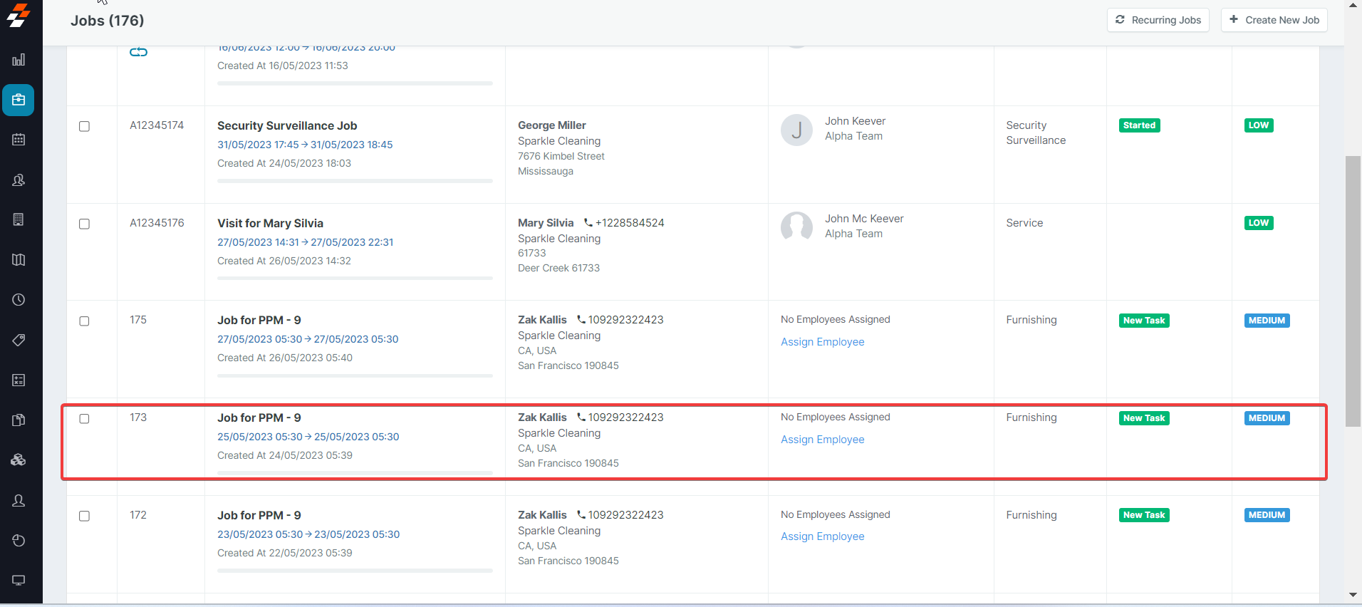 - Select the job that has an unassigned status and needs to be assigned to a Field Technician.