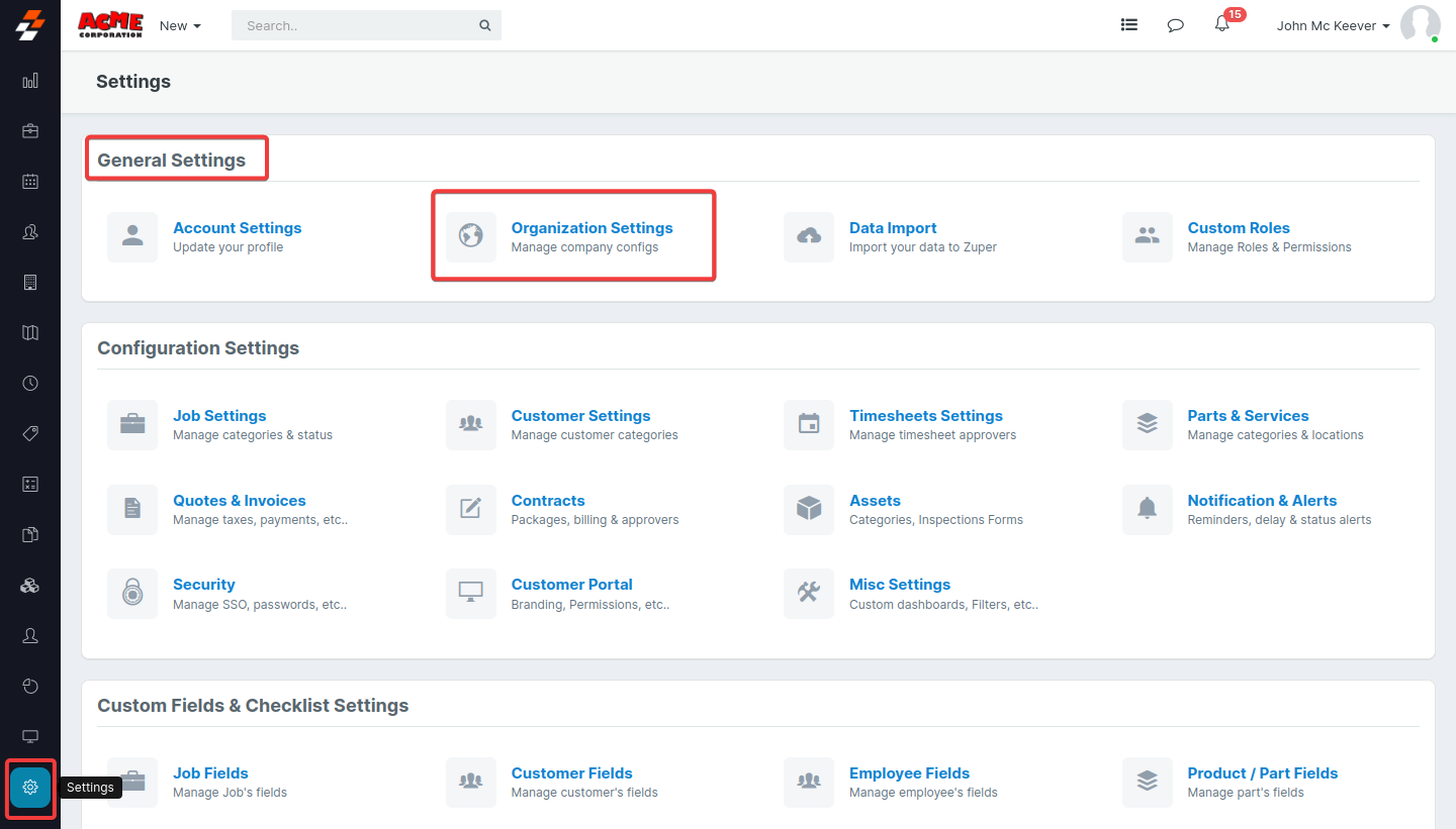 1. Select the “Settings” module from the left panel, and under the “General Settings,” choose “Organization Settings.”