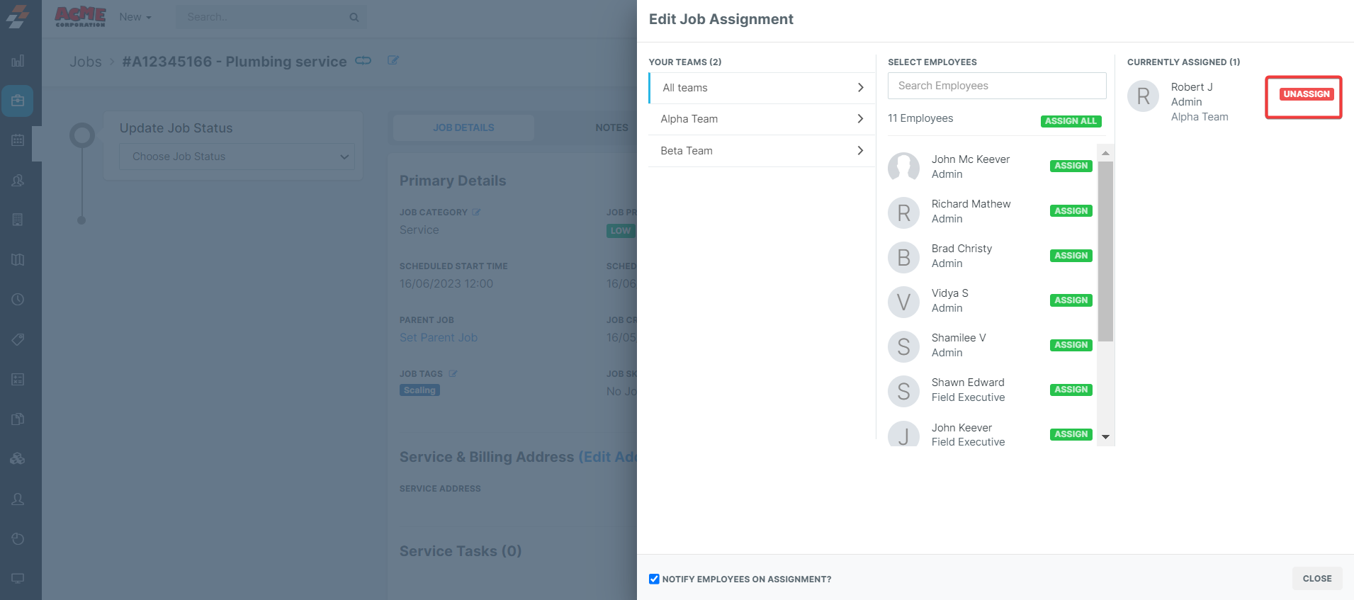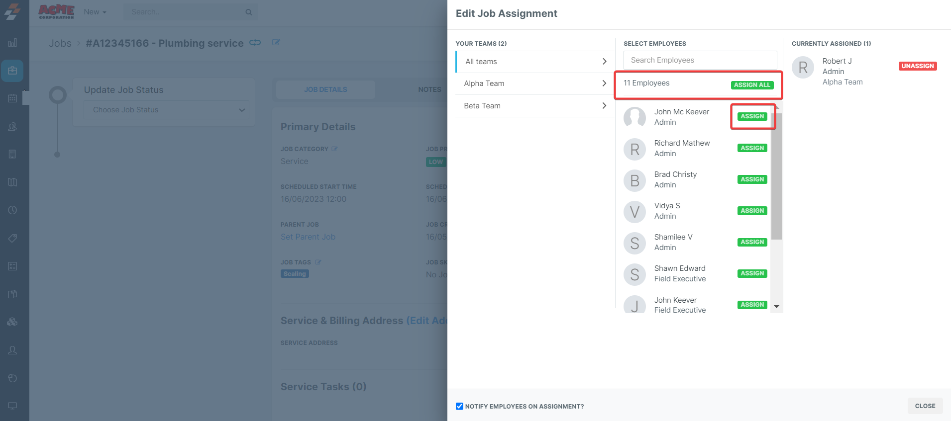 When you first create a new job and input all customer information, you'll find the Assign Employees Section which administers that specific job to your existing team of field service technicians.