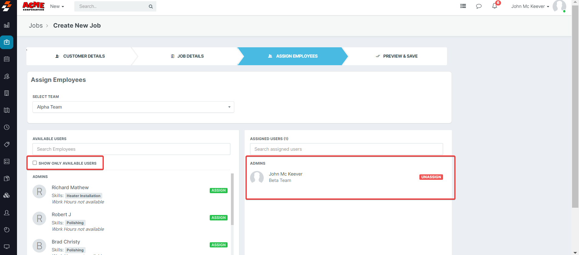 - Click on the Show Only Available Users checkbox to view a list of technicians who are available to take the job on the respective scheduled date.