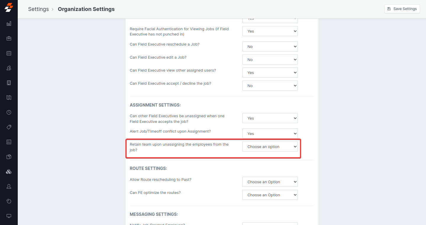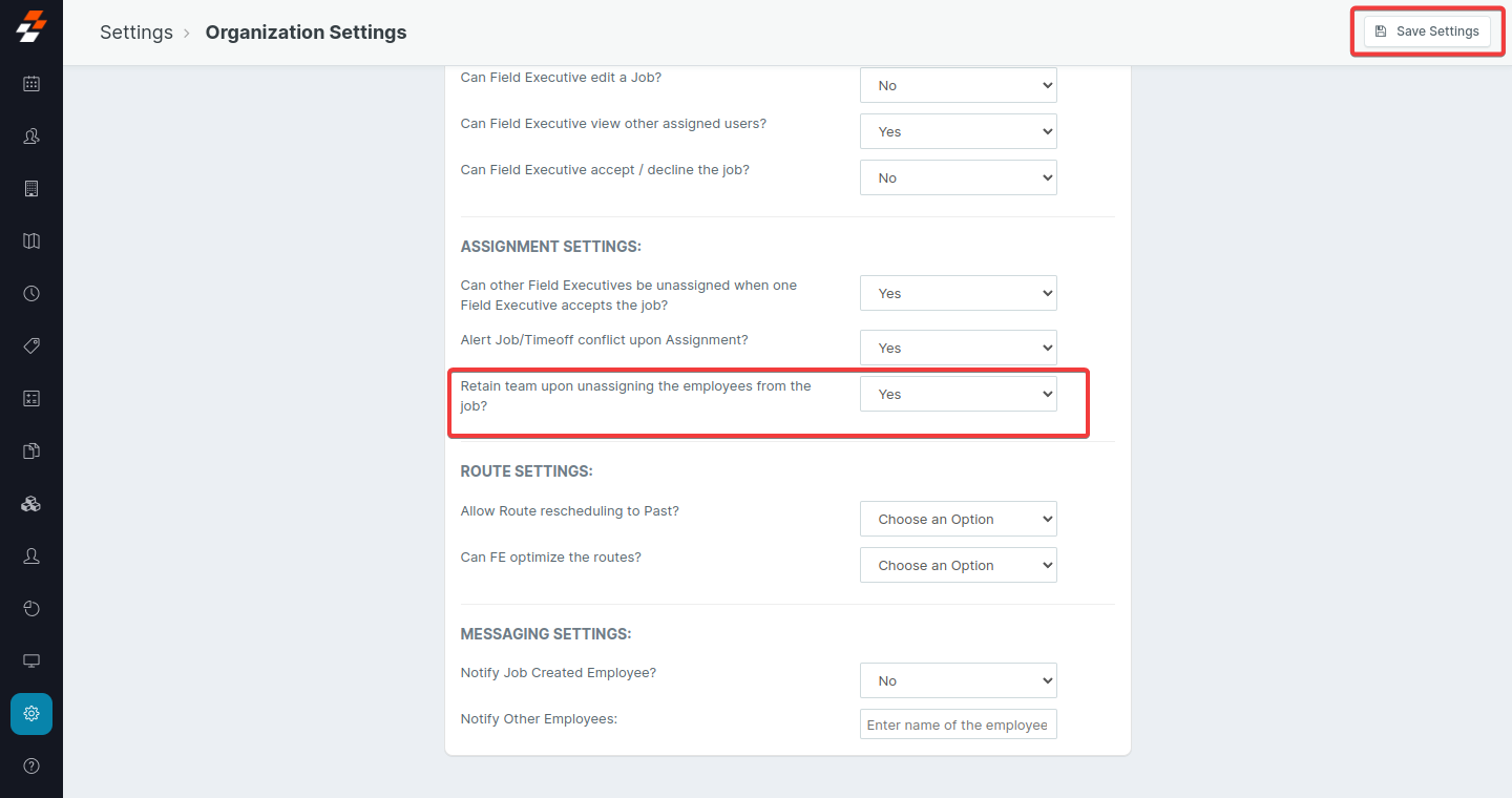 Navigation: Settings --> General Settings --> Organization Settings-->Retain team upon unassigning the employees from the job --> Yes