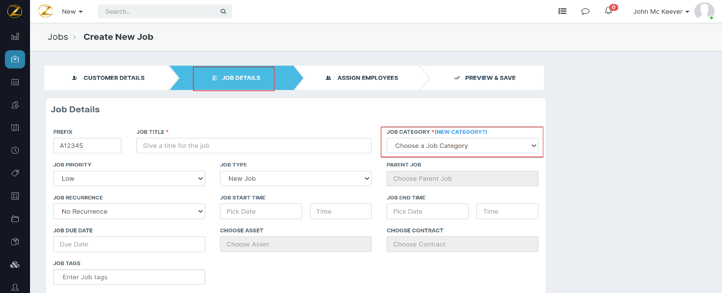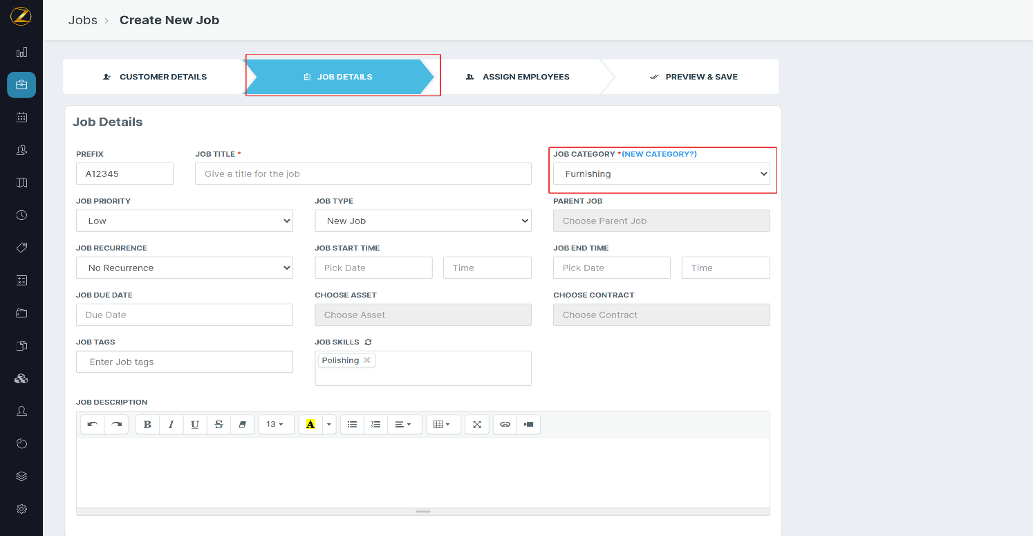 2. Select the “Job Details” tab and tap “Job Category” to choose the respective categories, The skillsets associated with the category are added automatically.