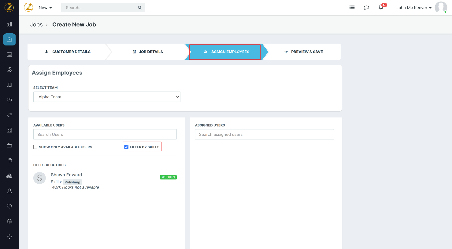 3. From the “Assign Employees” tab, select “Filter by skills Checkbox” to display only the field technicians with the skill set required for this job.