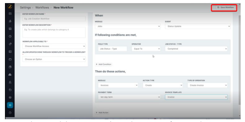 3. Enter the necessary details related to the sections “When”, “Conditions”, and “Actions” that is set to perform workflow action for the auto invoice. Then select, “Save Workflow” from the upper section.