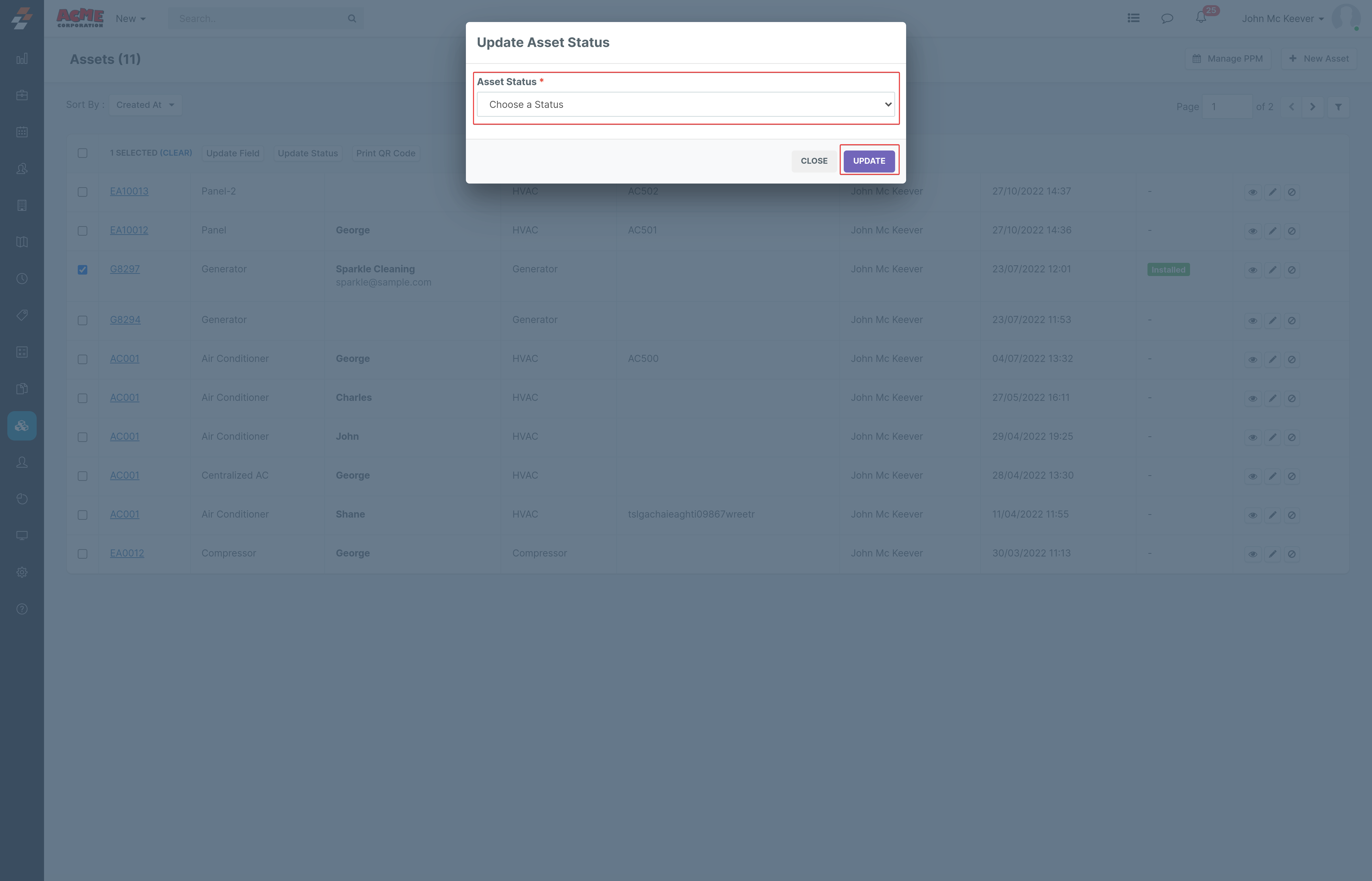 “Update Asset Status” pop-up