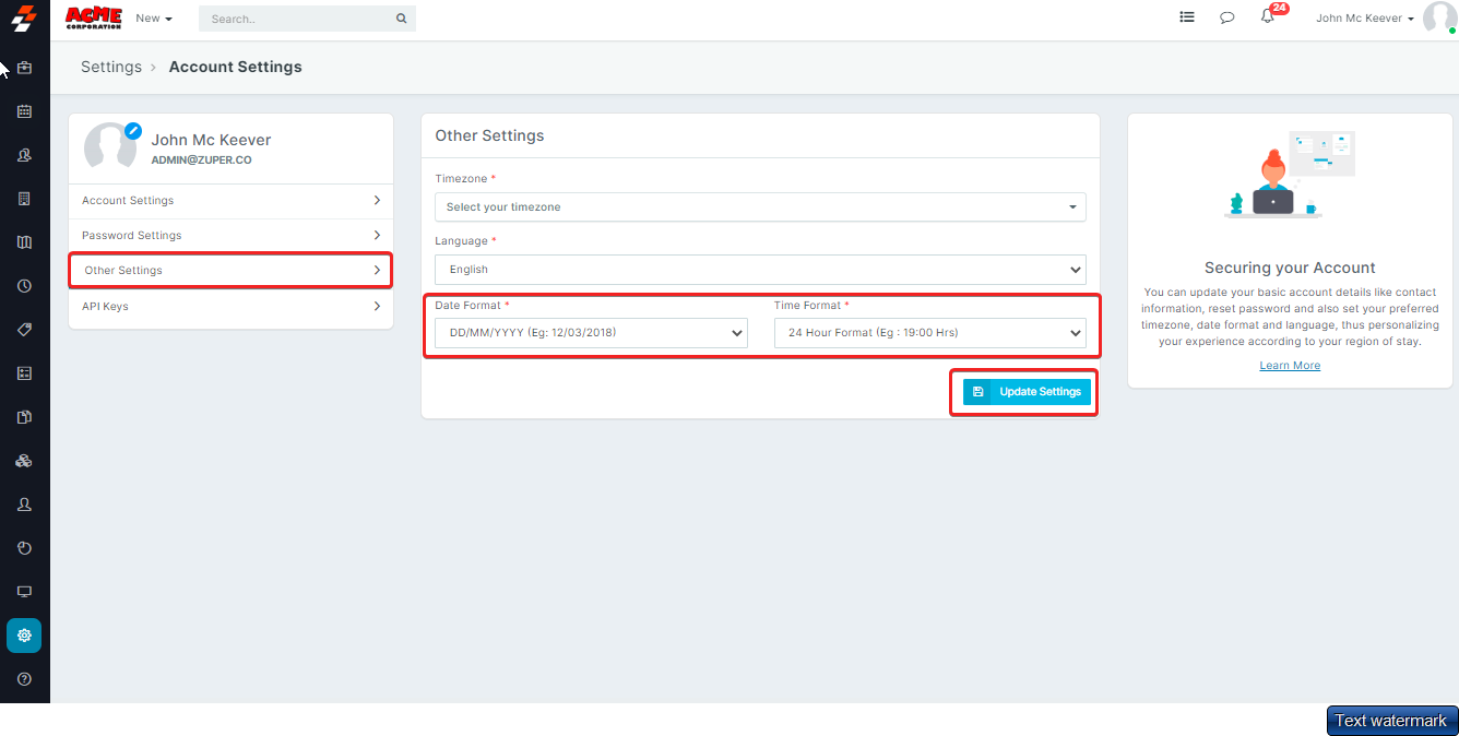 The Timezone of your Zuper account can be updated as per your preference. 1. Select the Settings module from the left navigation menu. 2. Under General Settings, click the Account Settings. 3. Click the dropdown and select your preferred Timezone. ...