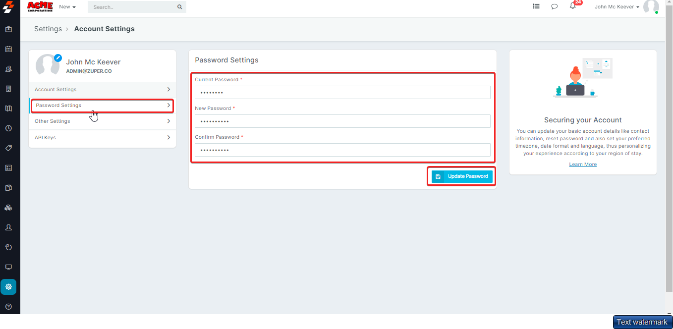 The password of your Zuper account can be updated as follows,