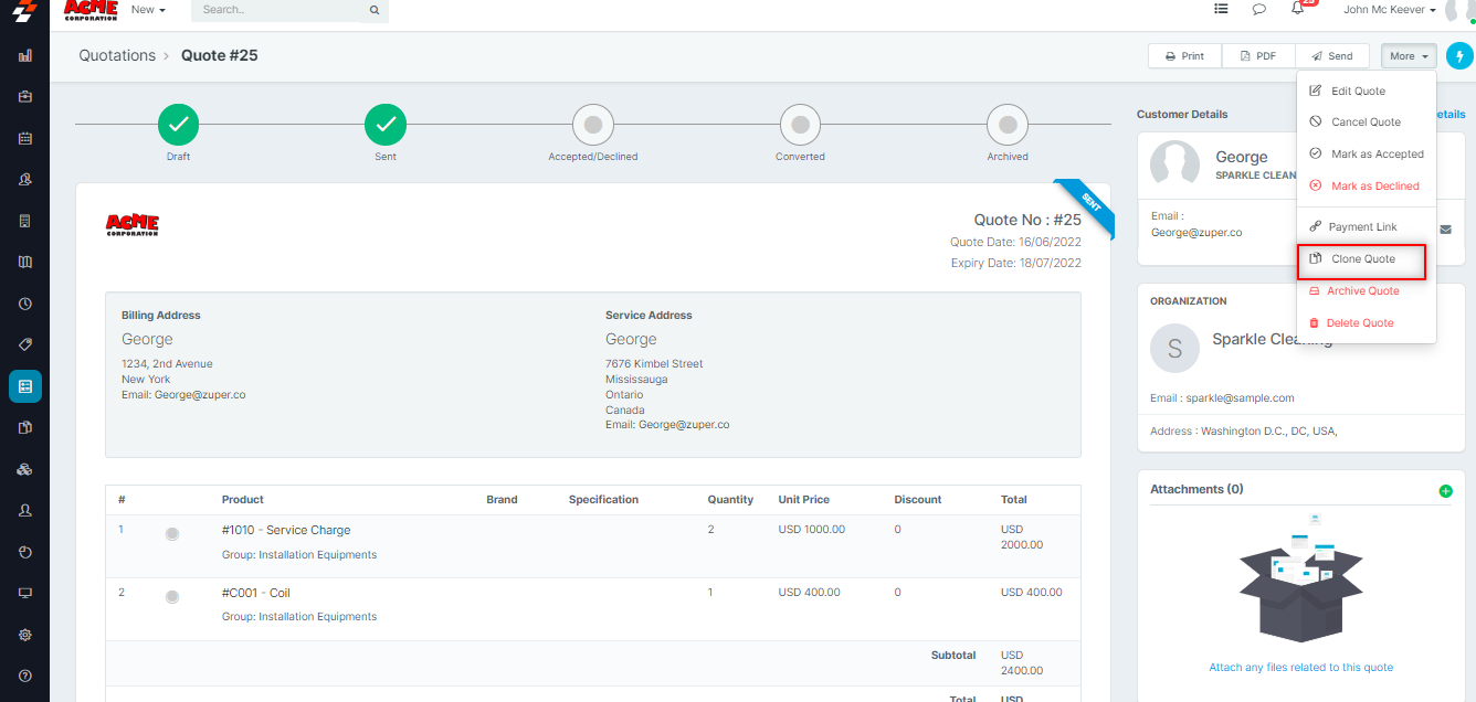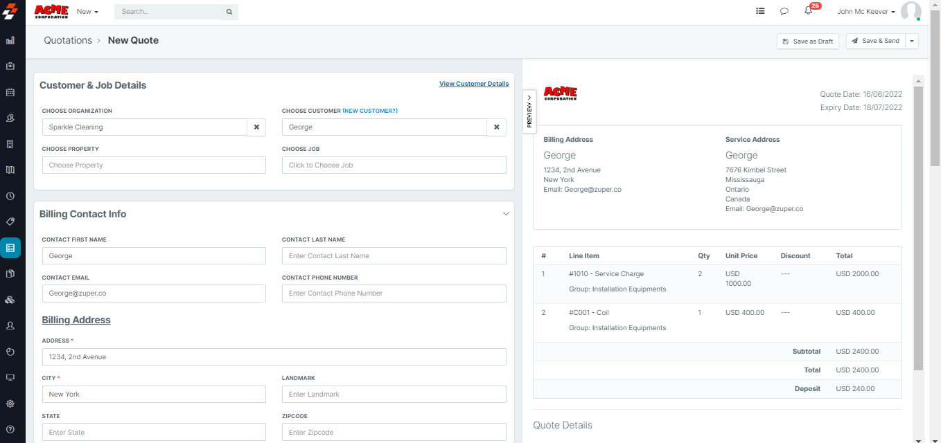 You can create a new quote for the existing job, and this saves your more time. 1. Select the "Jobs" module from the top-left hamburger icon. 2. Select the job, and from the Job details page, choose the "Kebab" icon from the top-right corner. 3. ...