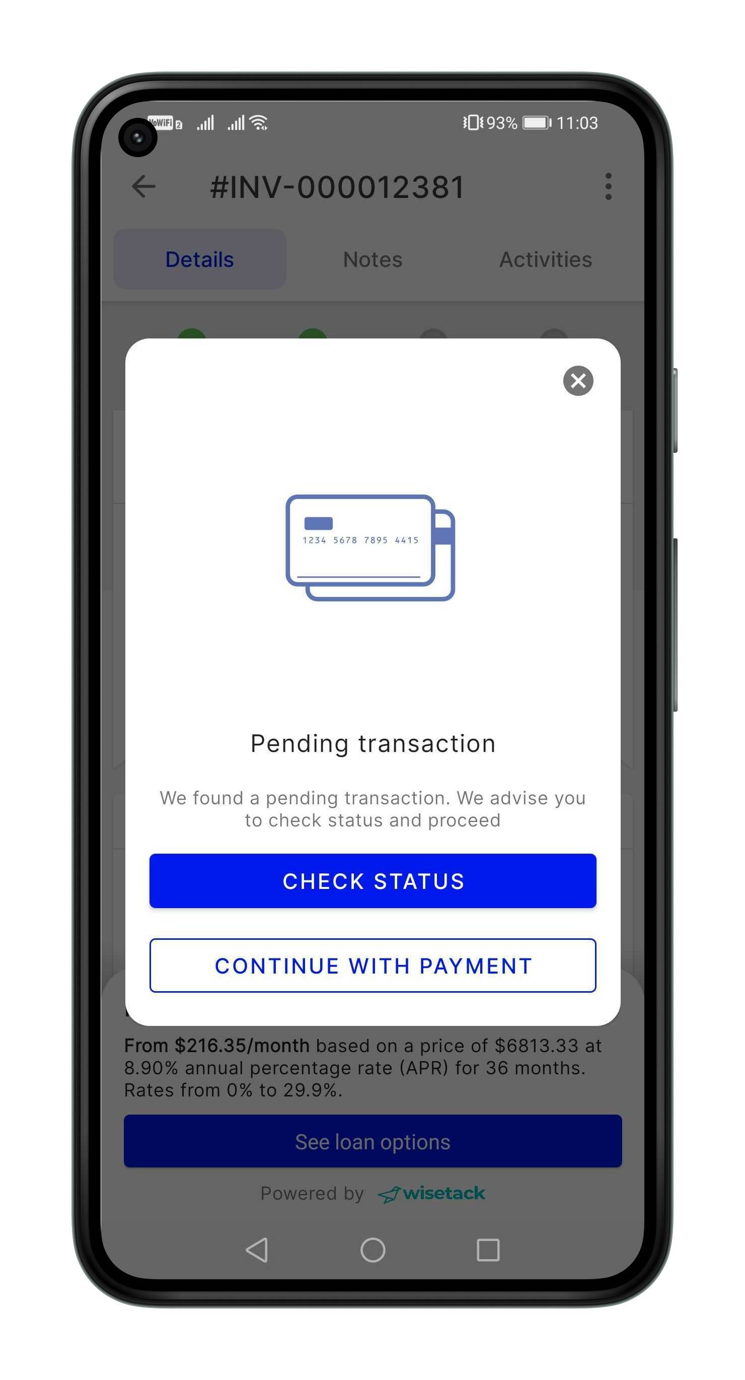 pop-up will prompt you to act for the pending payment, if it exists, for the