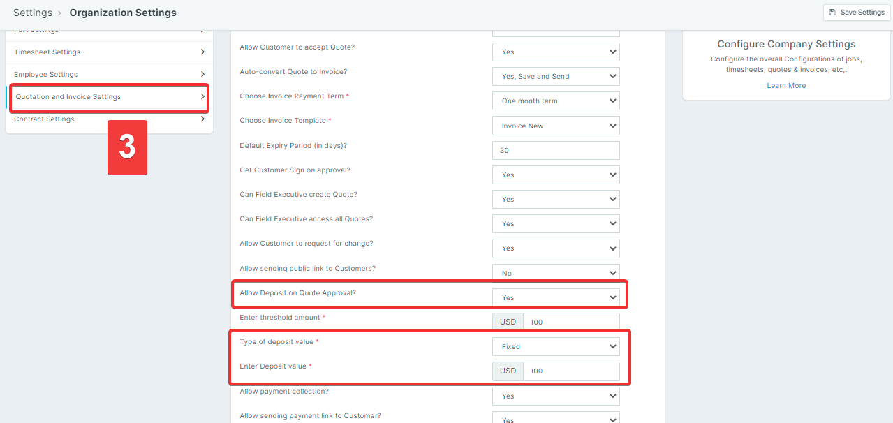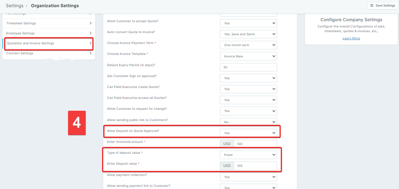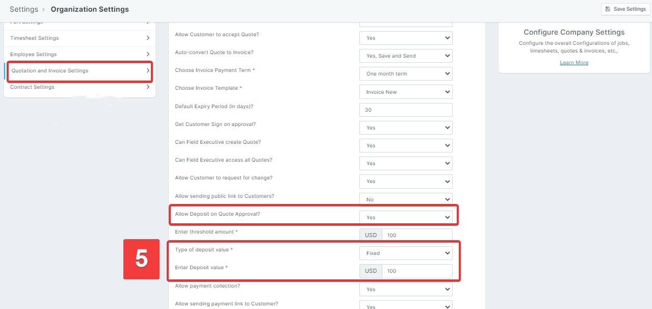 4. Under "Organization Settings," set "Yes" to "Allow Deposit on Quote Approval."