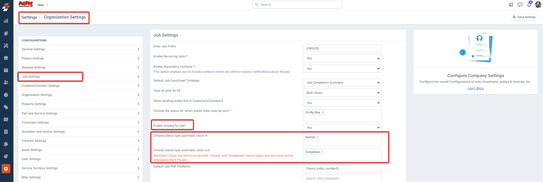 - Choose a status type for automatic clock-out: Select the job statuses that trigger automatic clock-out (e.g., Completed or Closed). All assigned employees will also be clocked out for the job.
