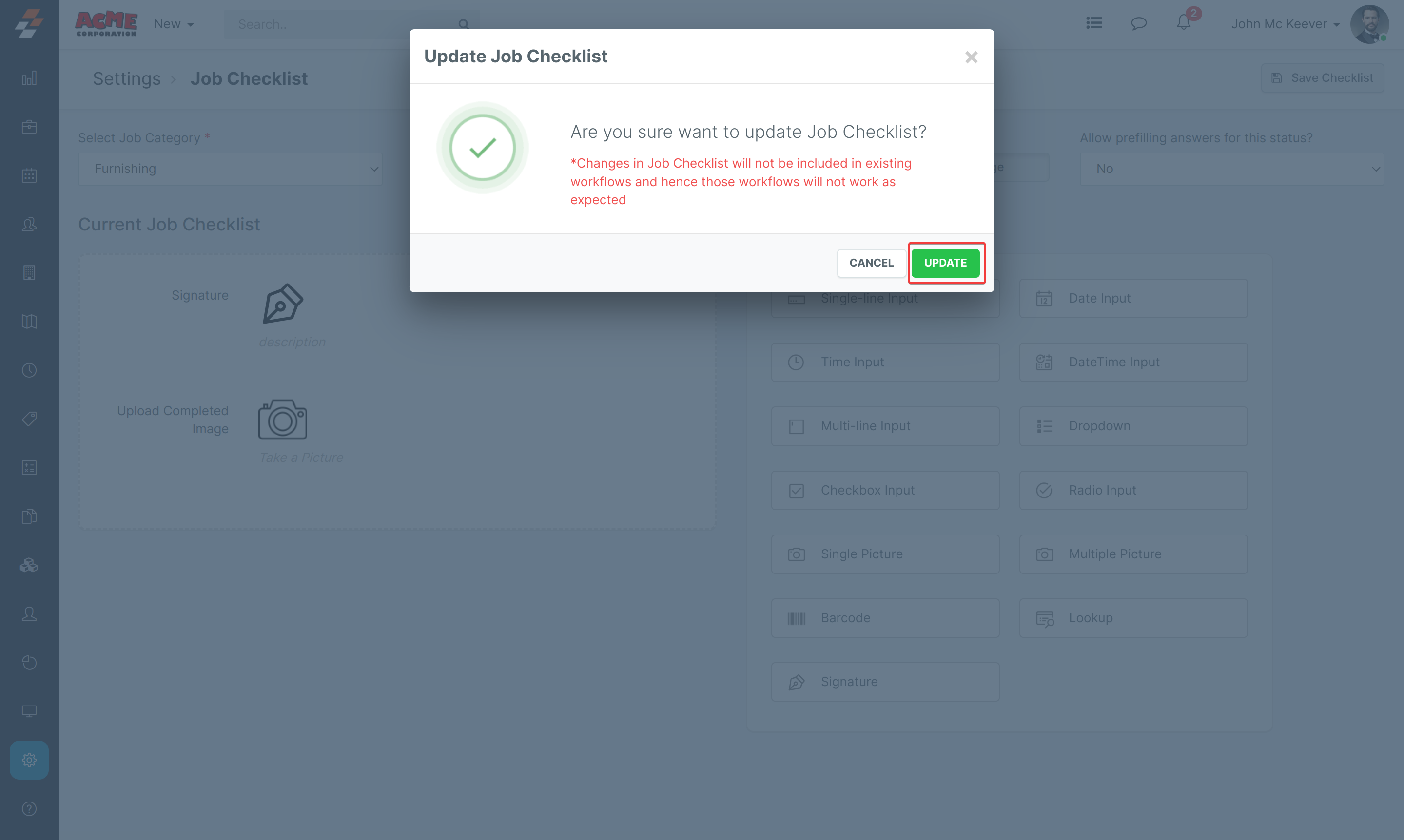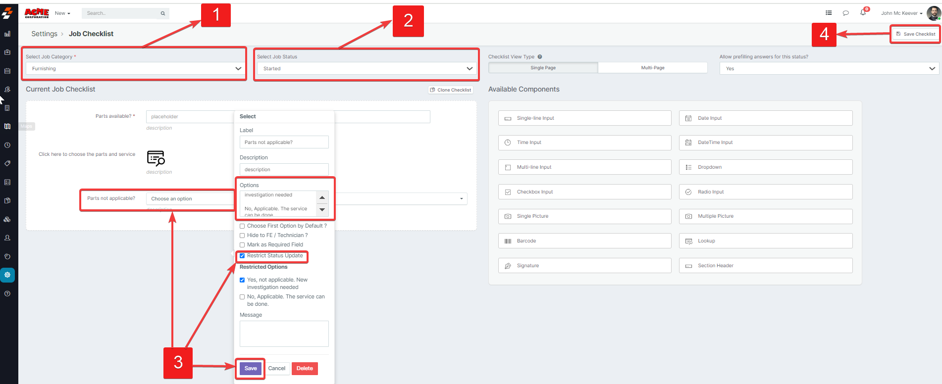 Navigation: Custom Fields & Checklist Settings -->Job Fields --> Checkbox / Radio Button / Dropdown --> Restrict Status Update