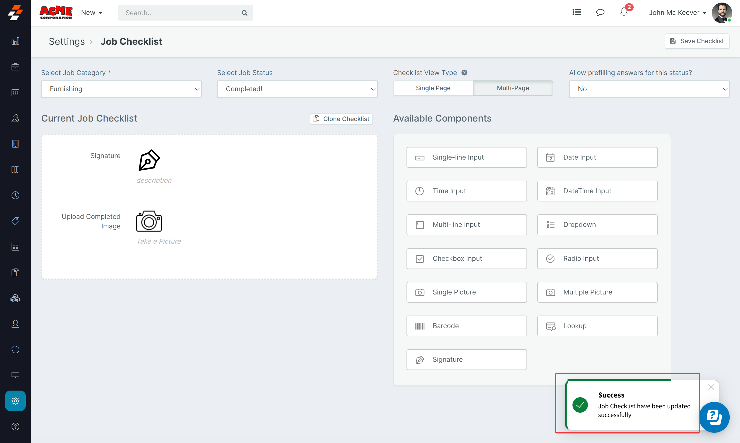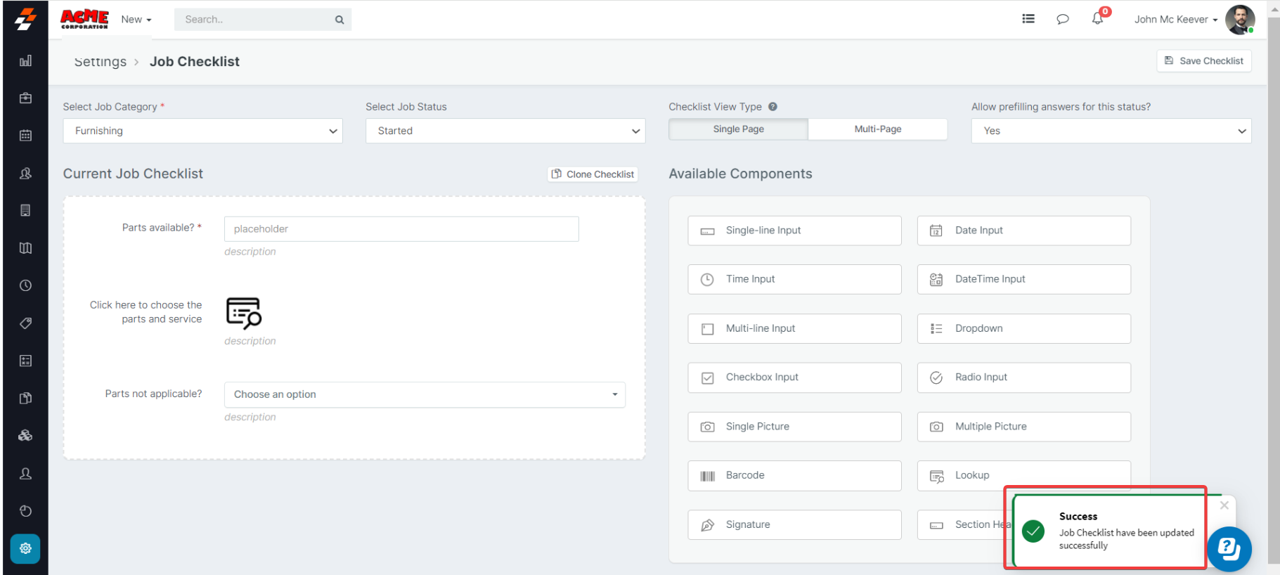 8. From available components, select the required type of field and drag it into the "Current Job Checklists" section and click on the component to edit it. Once you have edited the checklist to meet your requirements, click on "Save Checklist".