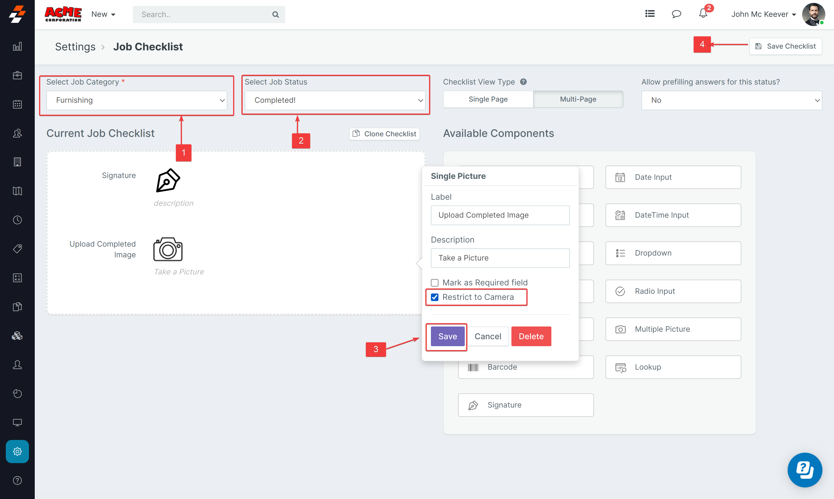 Navigation: Custom Fields & Checklist Settings -->Job Fields --> Single Picture / Multiple Pictures --> Restrict to Camera