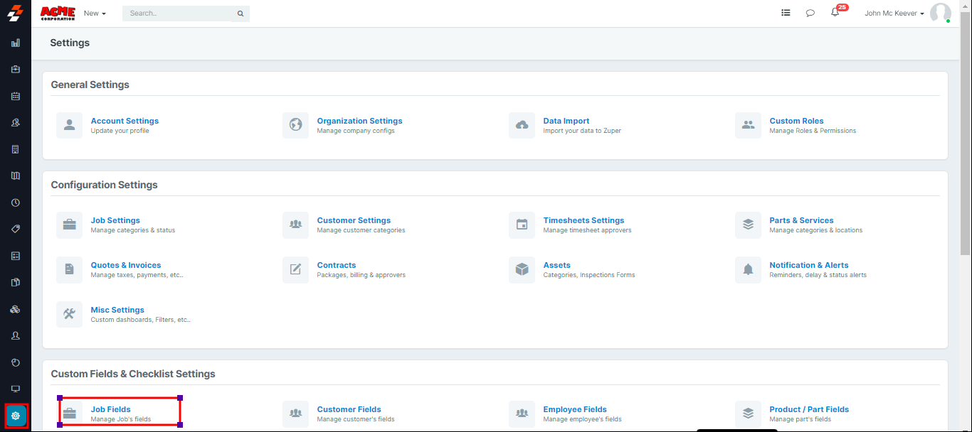 left panel and choose the “Custom Fields & Checklist Settings,” and select the “Job Fields” section.