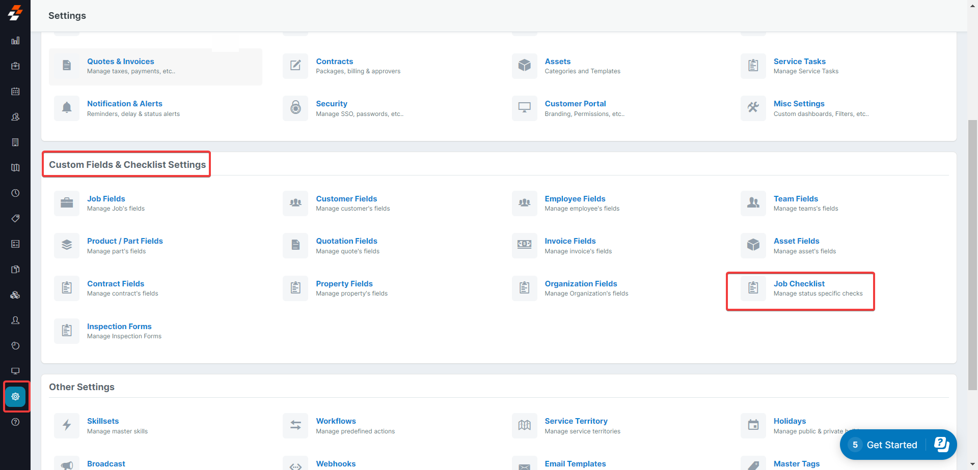 1. Select the “Settings” module from the left navigation menu, and under the “Custom Field and Checklists,” choose the “Job Checklist.”