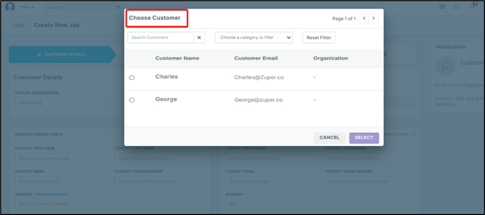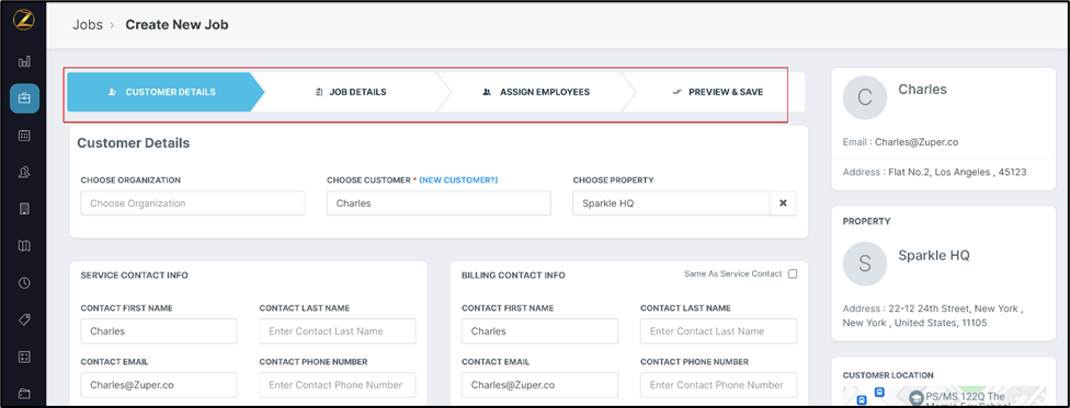 A. Customer Details – In this tab, you can enter the details related to the customers from Organization to Billing and Service Details.