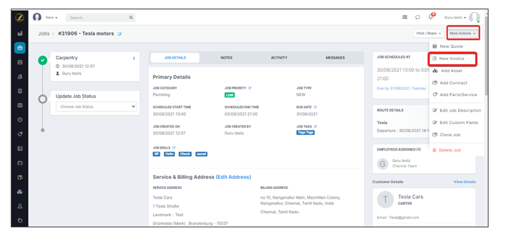 Invoice” option under the “More Actions” section for the created Job,