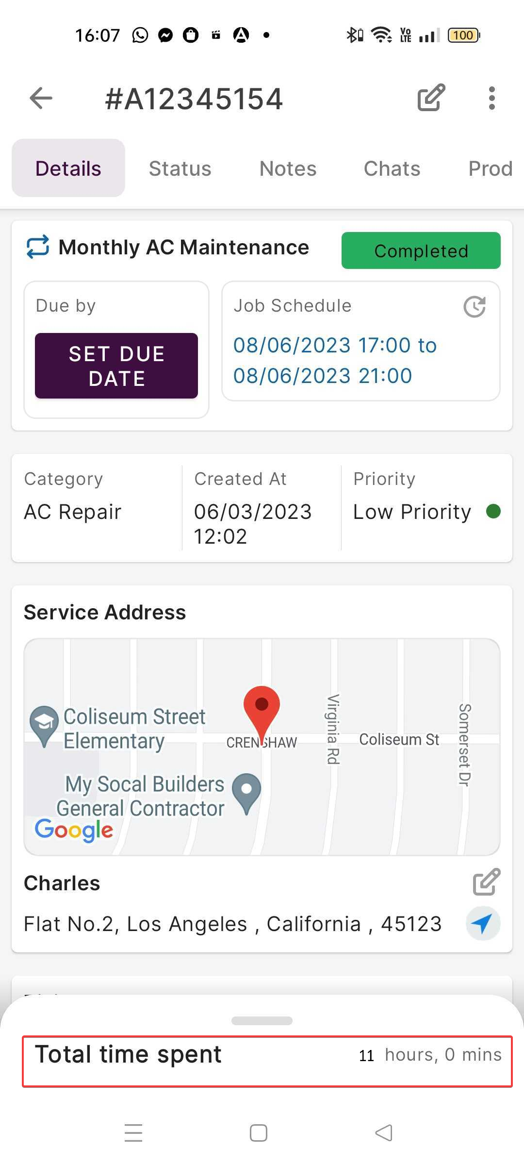 The Job time log enables the user to know the work hours spent by the field executives on the Job.