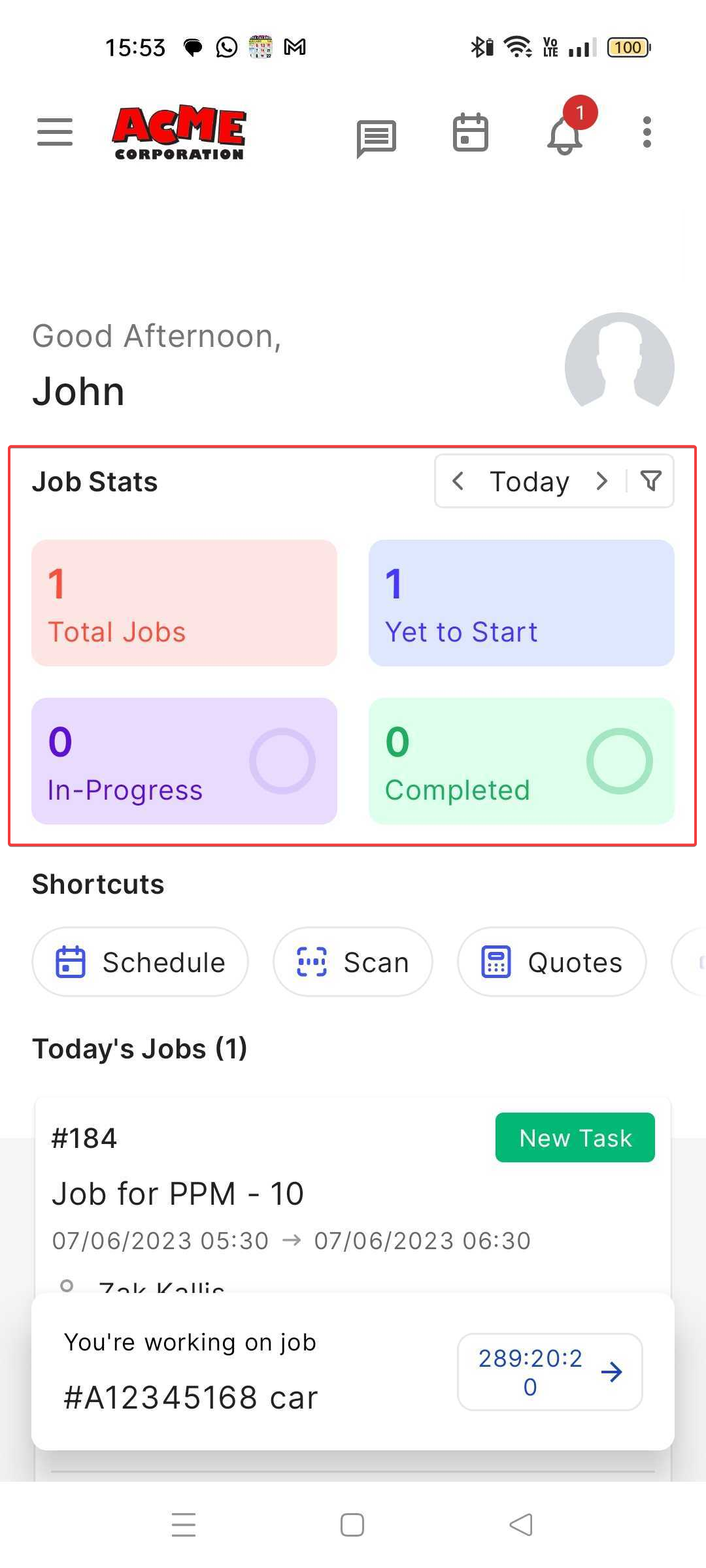 1. Login to the Zuper Mobile App, and you can view the Job statistics directly.