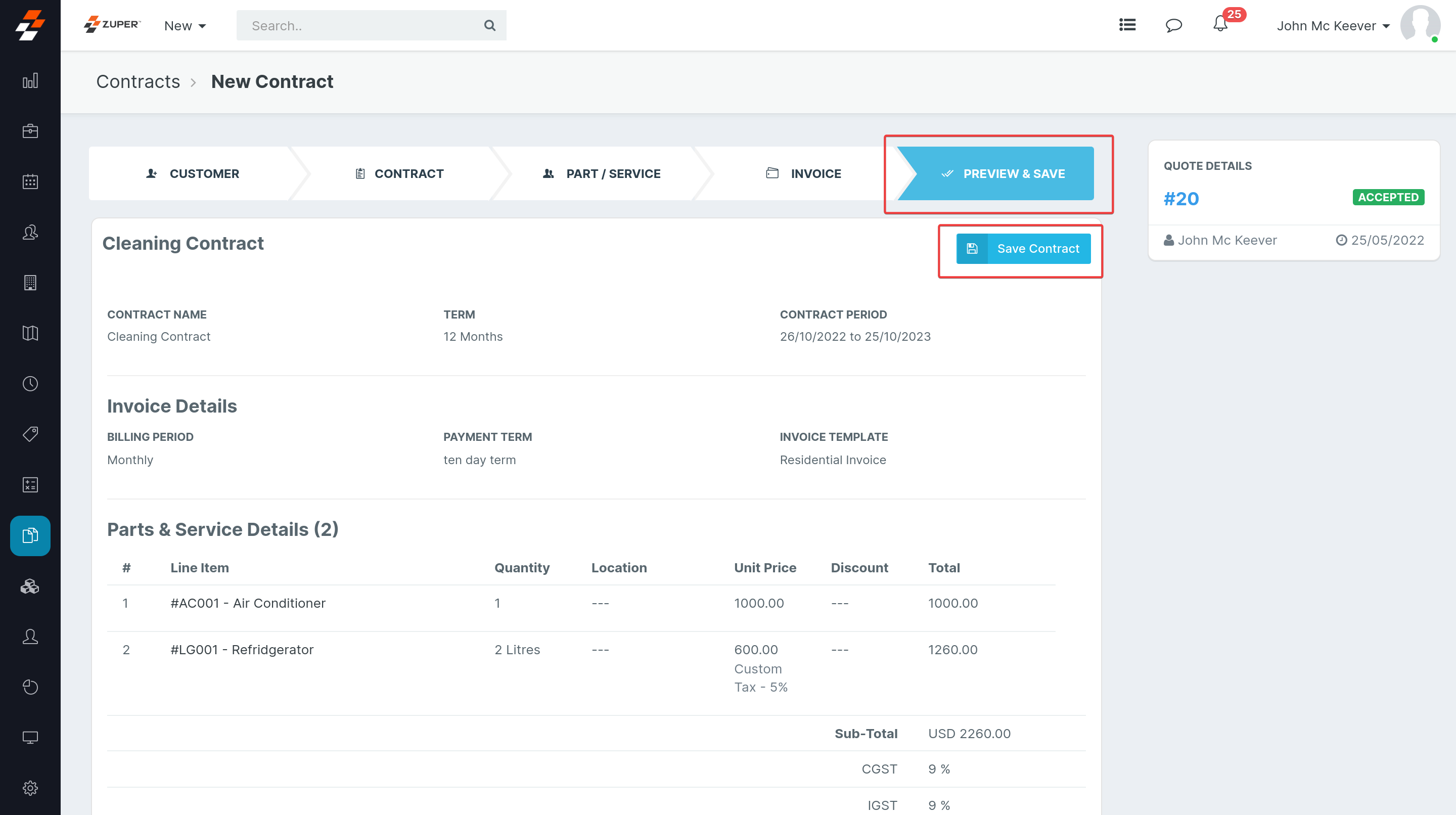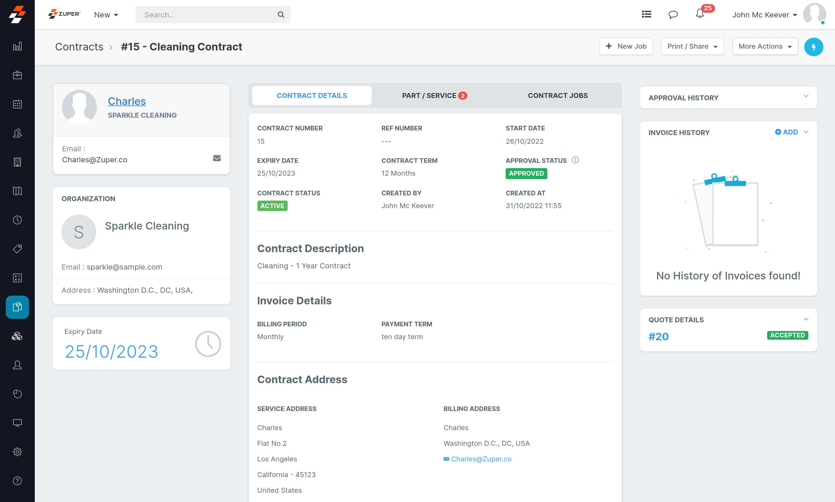 The service contract is the service agreement between the business and the customer, lists down services that need to be performed, timeline, and other vital information. Zuper allows the user to experience the best service contract creation for you, ...