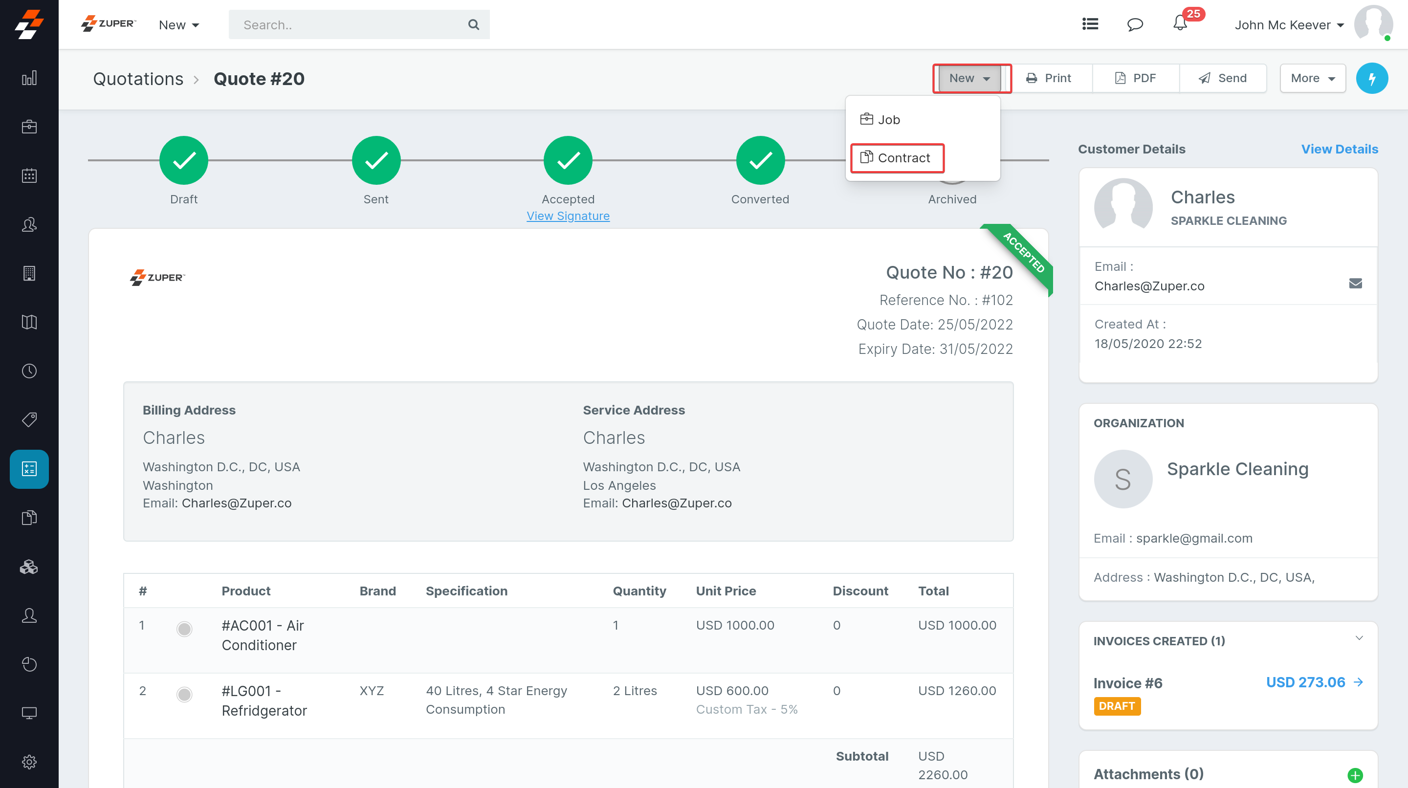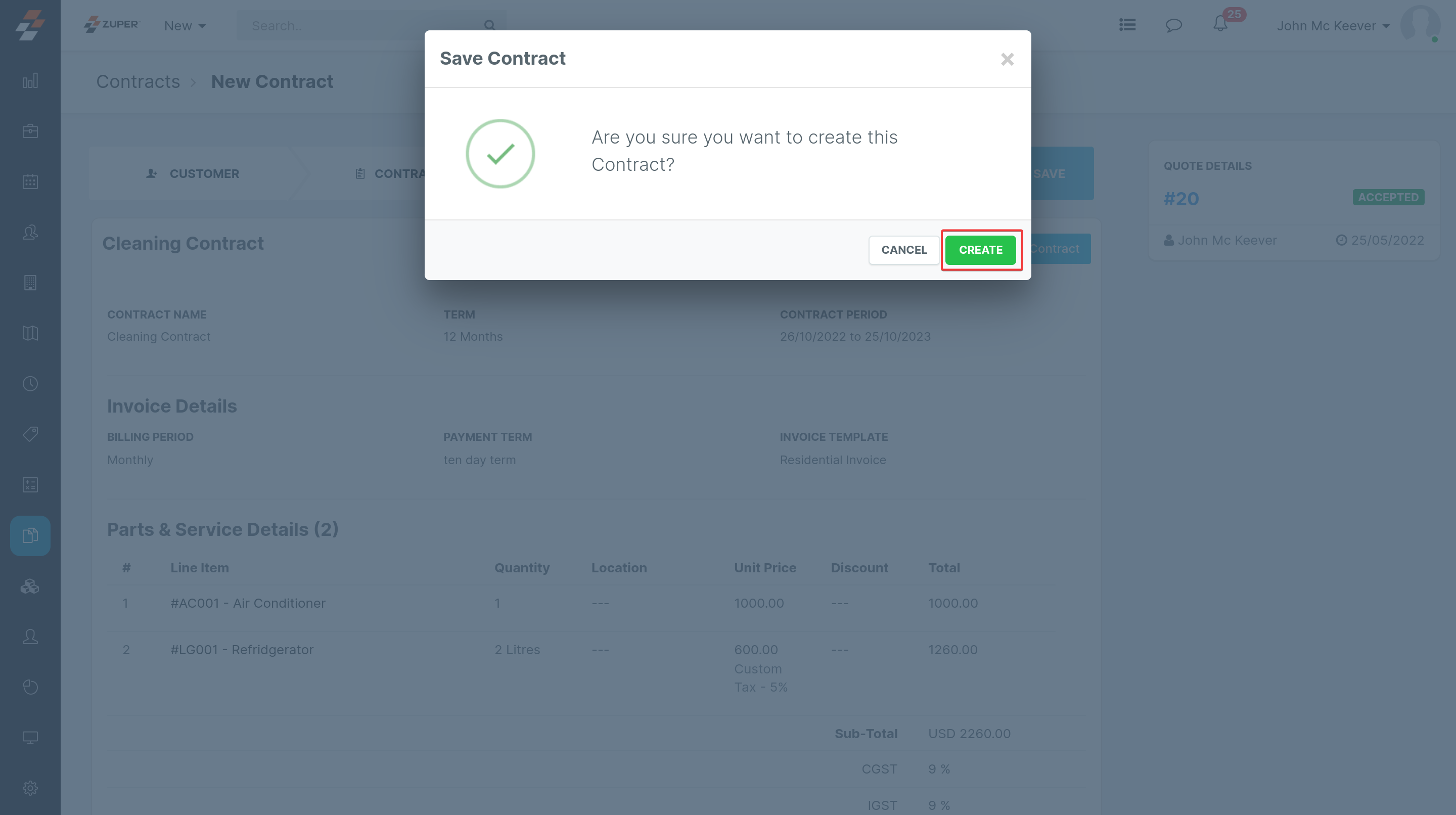appear, and you can select the “Create” button to generate a new contract against the existing Quote.