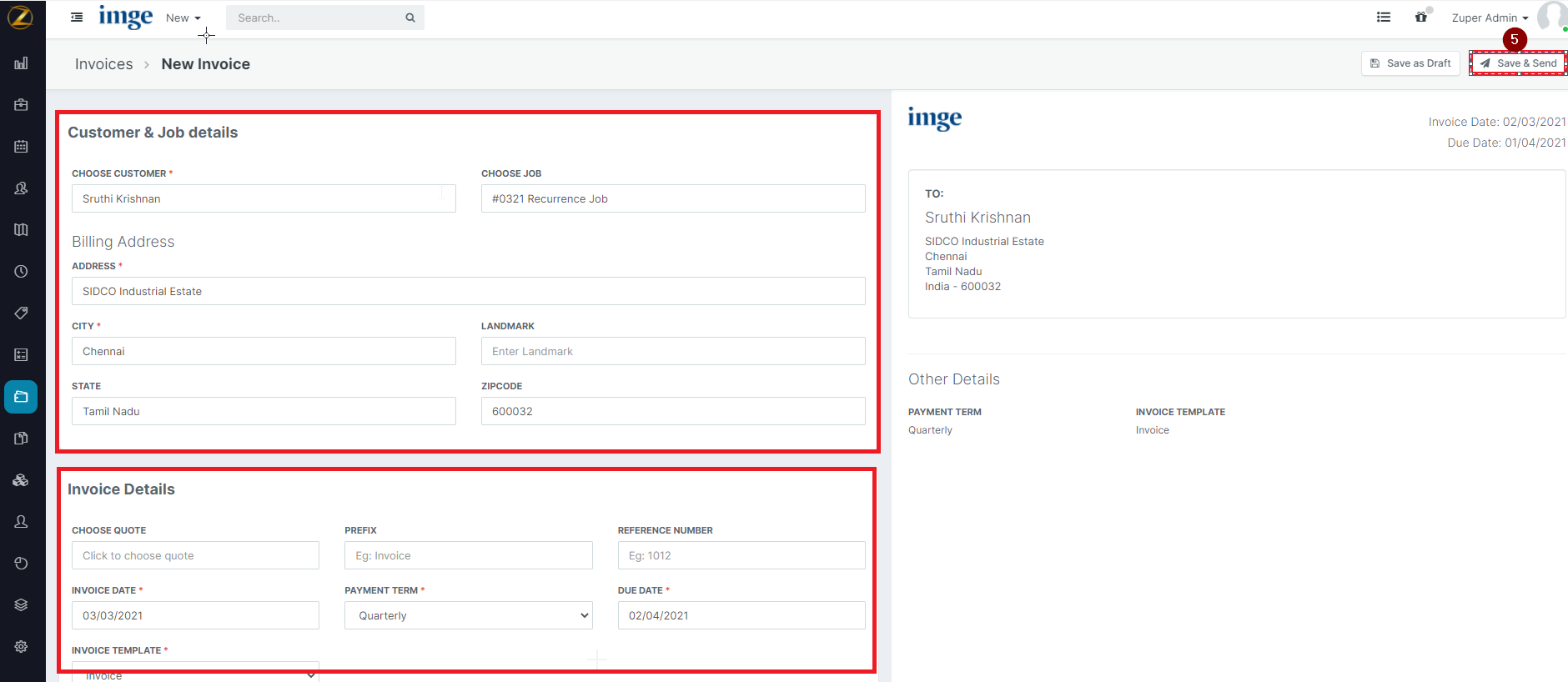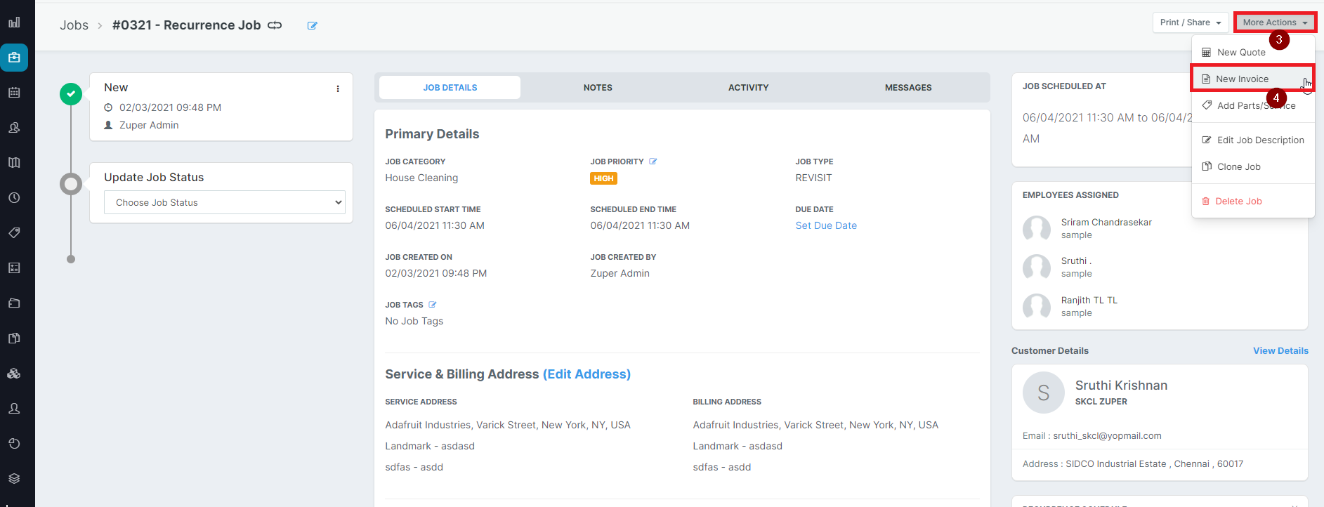 (Note: New Invoice button will be visible only if your organization has enabled Zuper's Invoice Module).