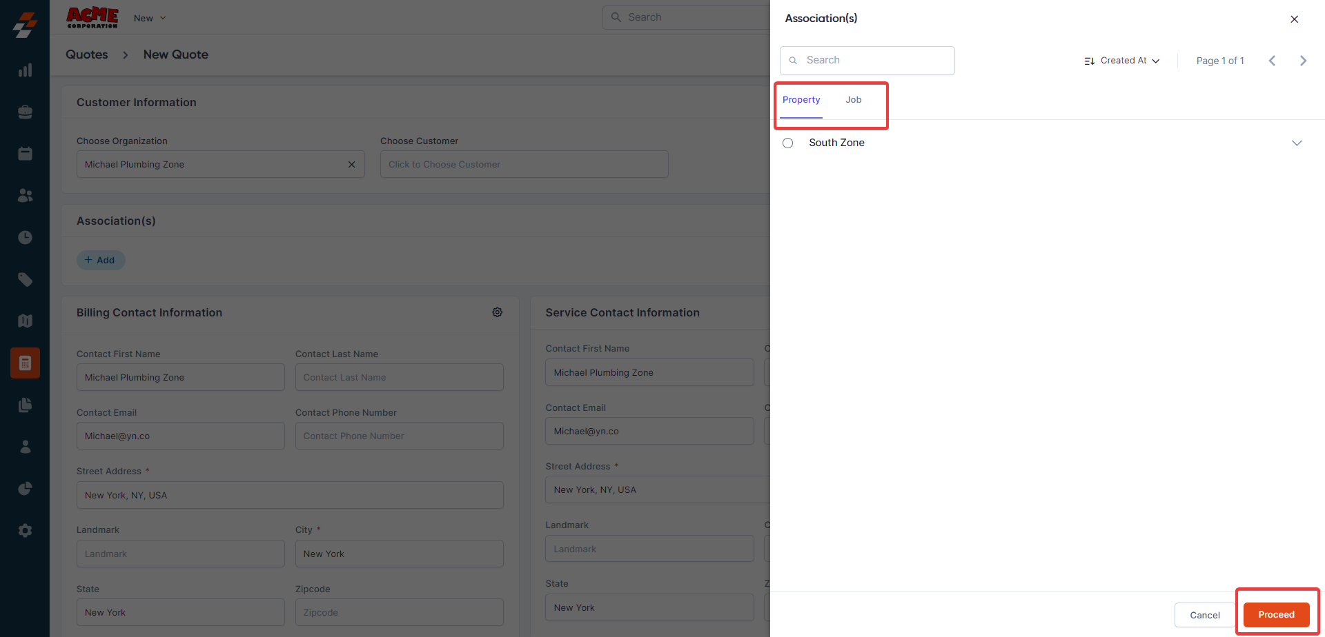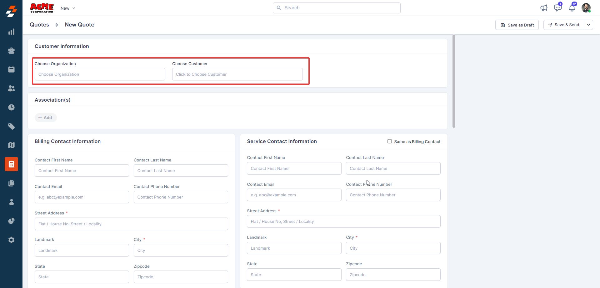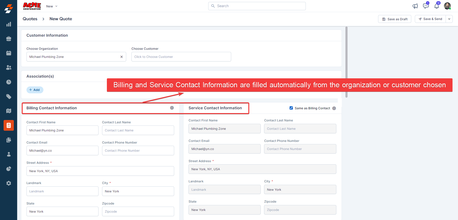 5. The billing and service contact information are filled automatically based on the organization or customer chosen.