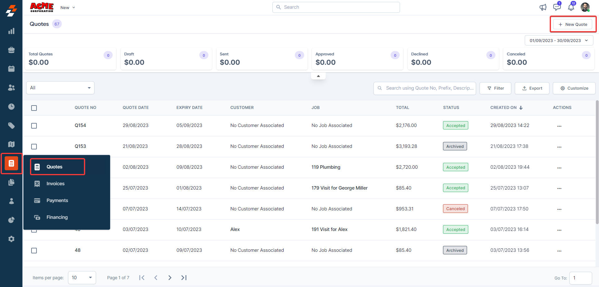 • How to navigate and manage the Quotes listing page in the Zuper web app?
