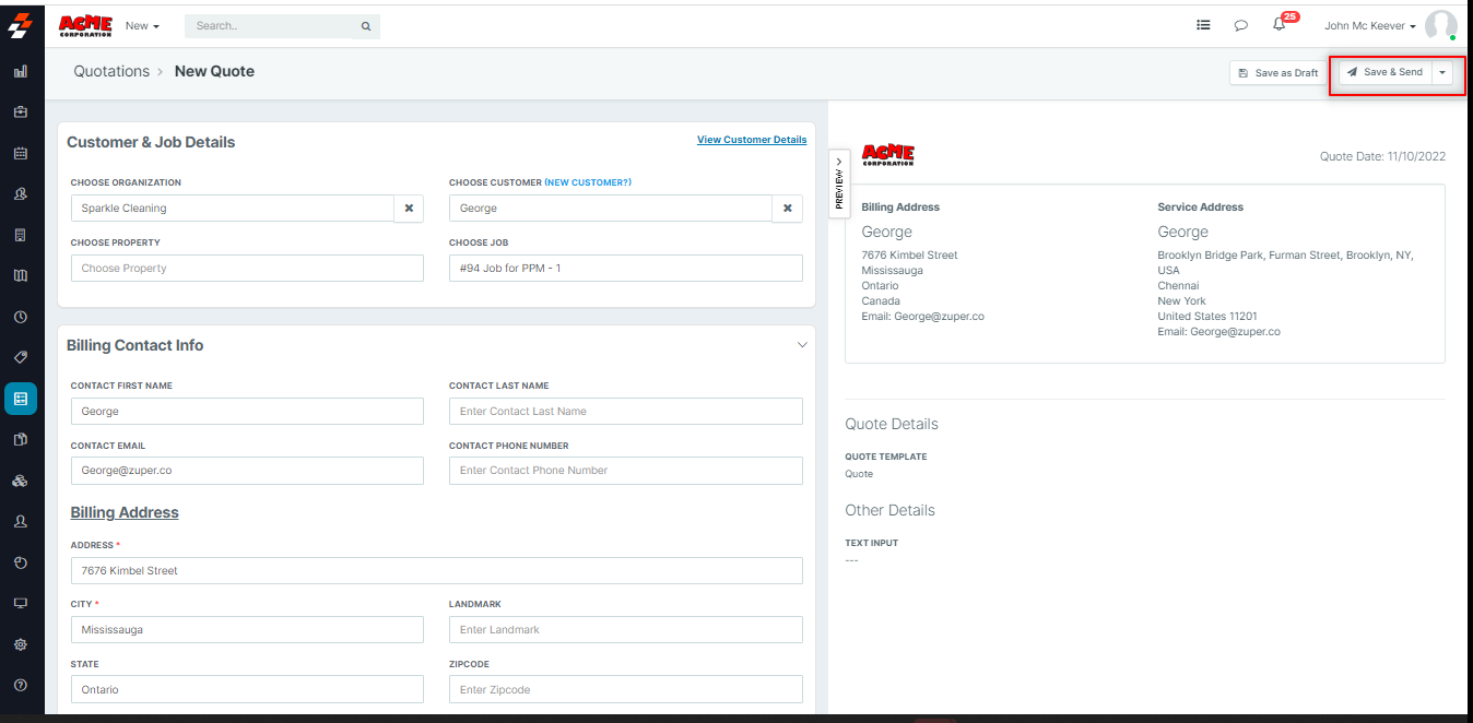 - Once you fill in Quote Details and choose a Quote Template, you can either save that specific quote as a draft or send it to your respective customer.