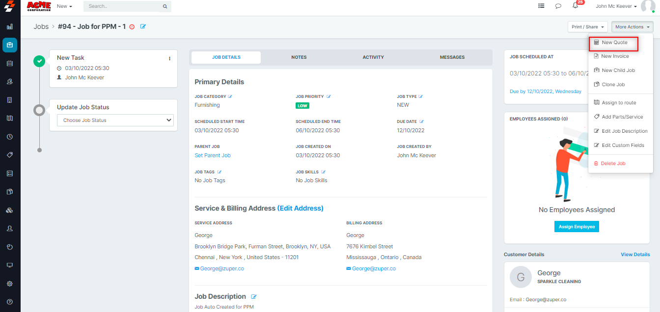 - Once the Job Details Page opens, click on the “More Actions” dropdown and select New Quote.