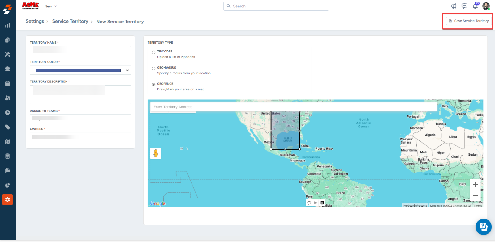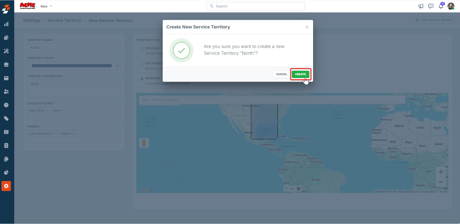 4. Click the "Save Service Territory" button to confirm the creation of the new region, and then click the Create button to save the created service territory.