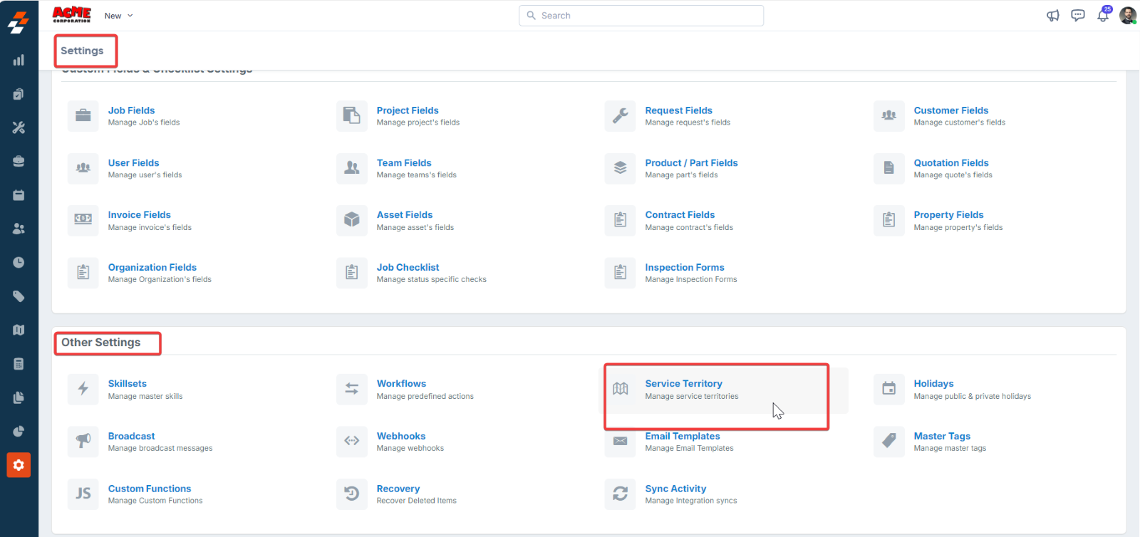 1. Click the "Settings" module, and under the "Other Settings," select "Service Territory."