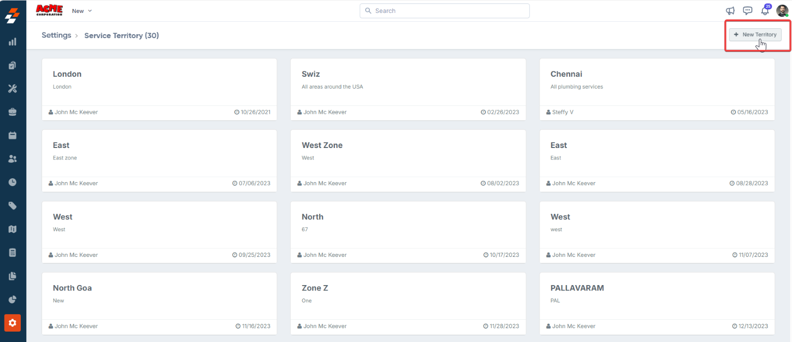 Create a new service territory: Service Territory is more like a location range from which a team of employees works on jobs within that territory. You can create a new territory, edit or delete a territory. Navigation: Settings --> Other Settings ...