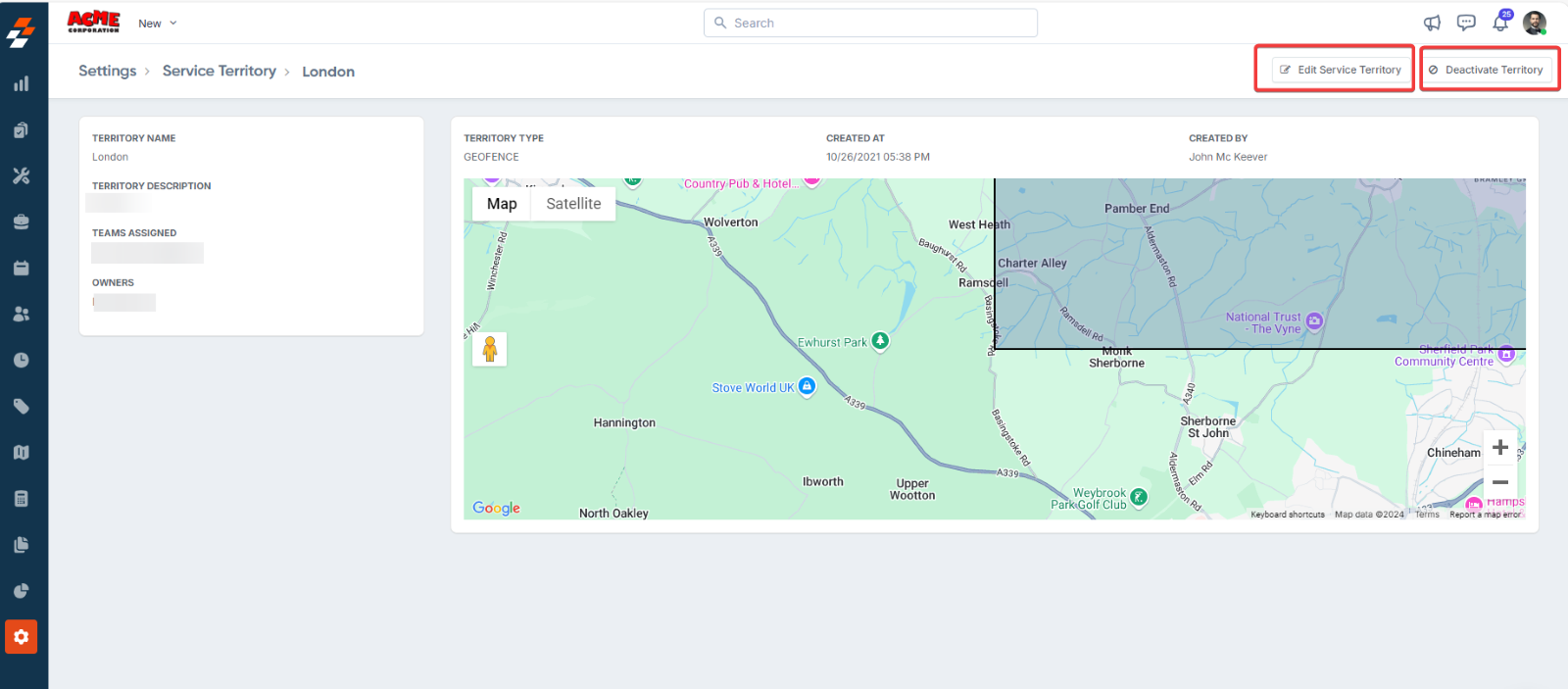 Note: Modifying a service territory can affect jobs already assigned to it. Before making changes, consider the implications for job assignments. - Deactivate territory: Use this option to deactivate the service territories.