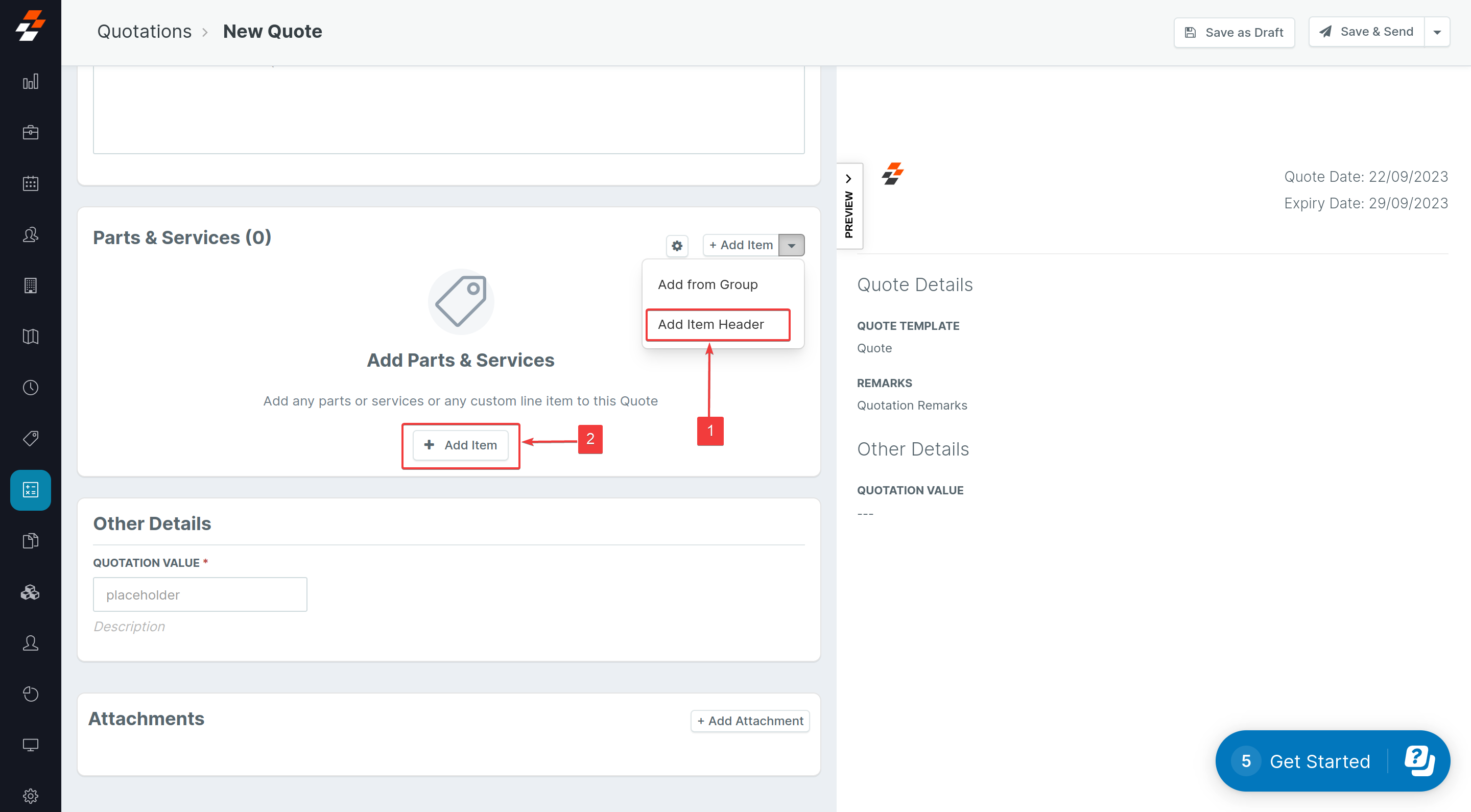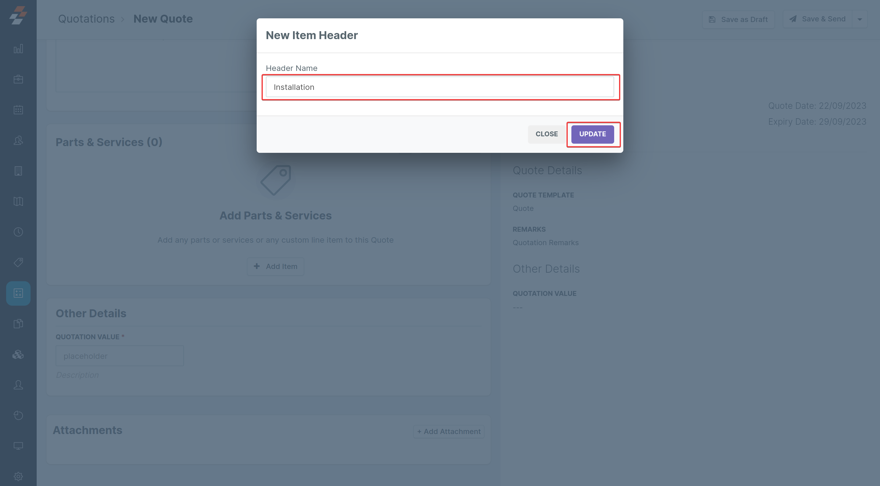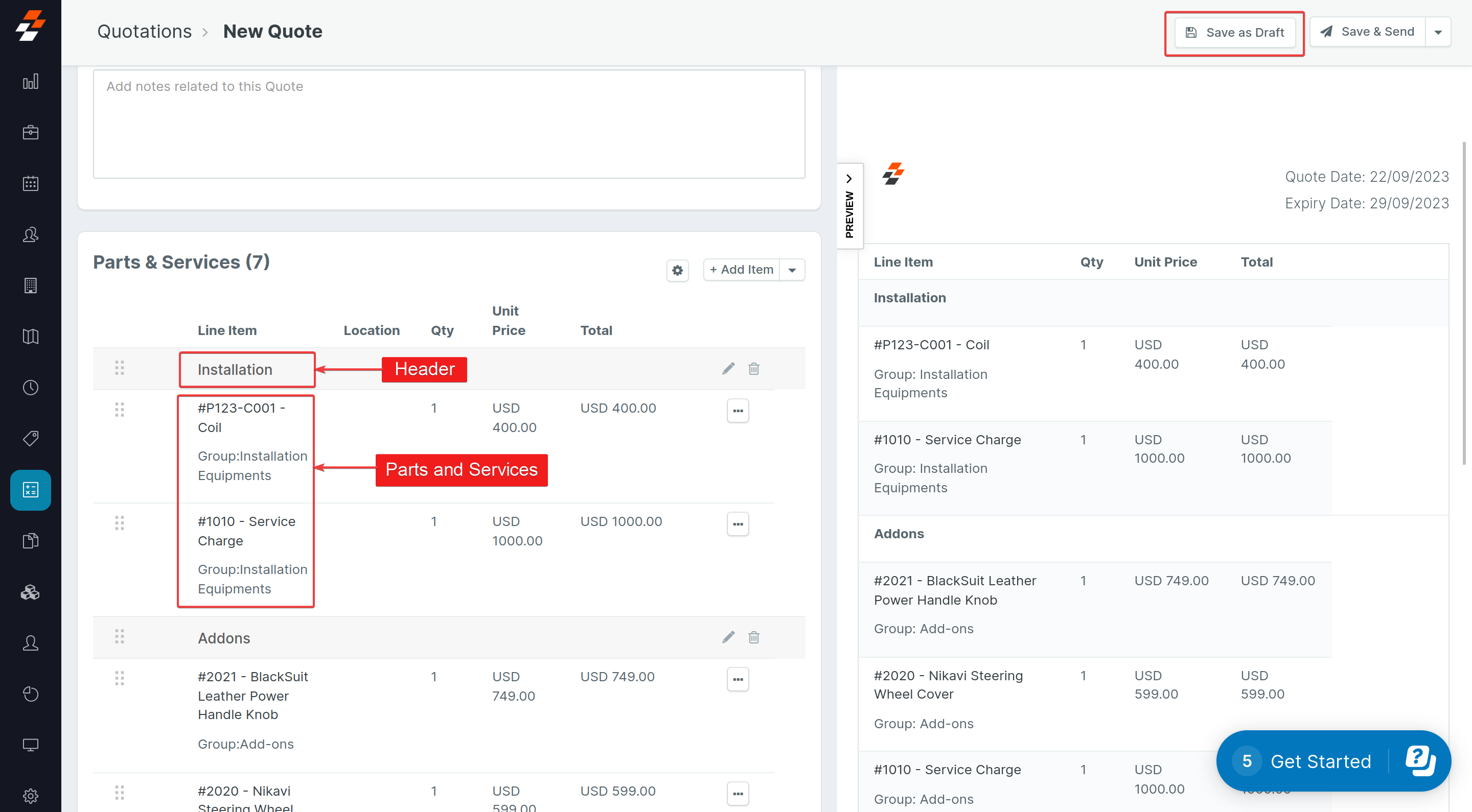 A quotation also known as estimate is a document that covers the parts or services you’ll need to complete a job and approximately how much they will cost. Quotations are sent to customers before the commencement of a job for acceptance. Once accepted by the customer, technicians will perform the services or replace the parts listed in the quote to complete a job.
