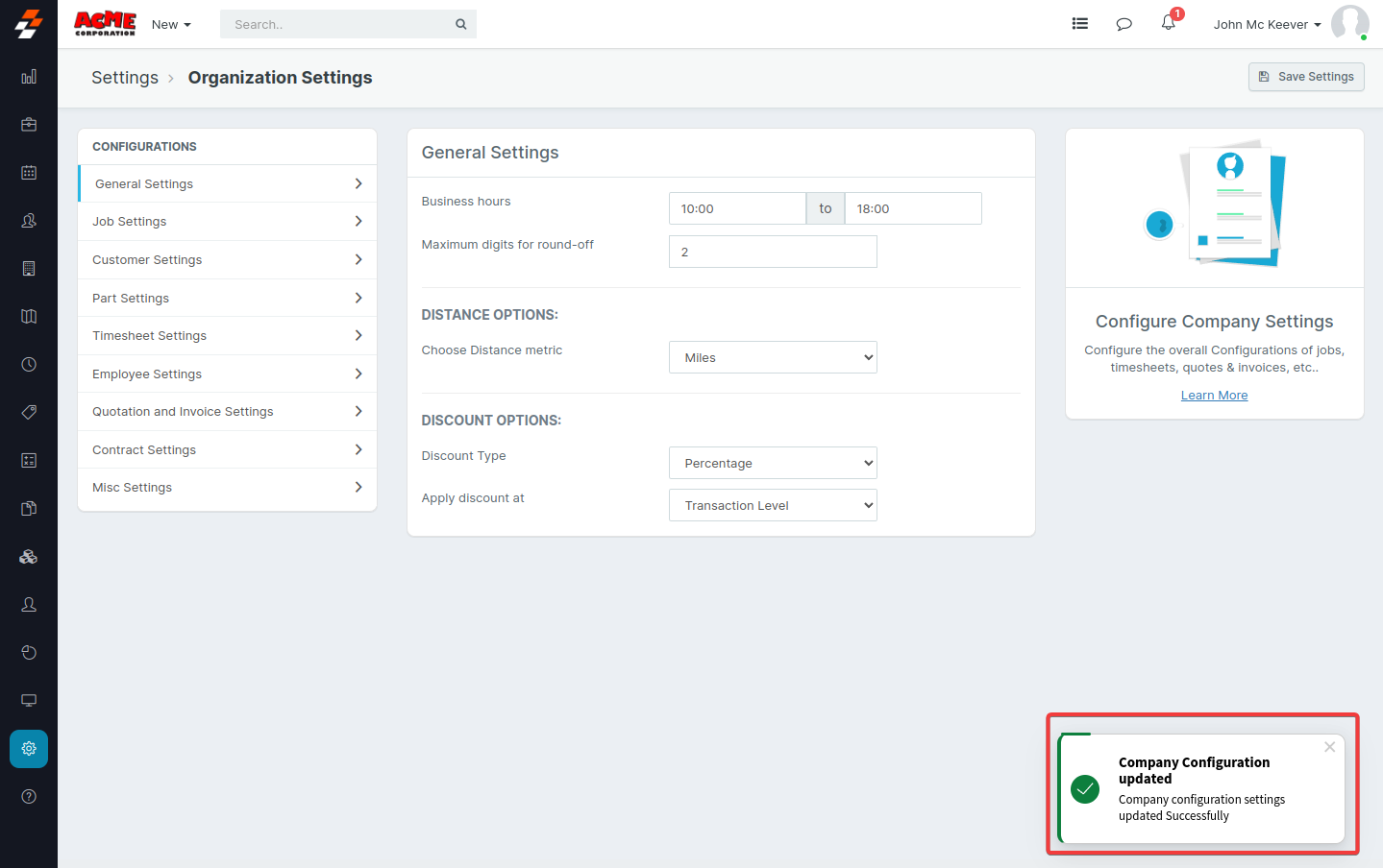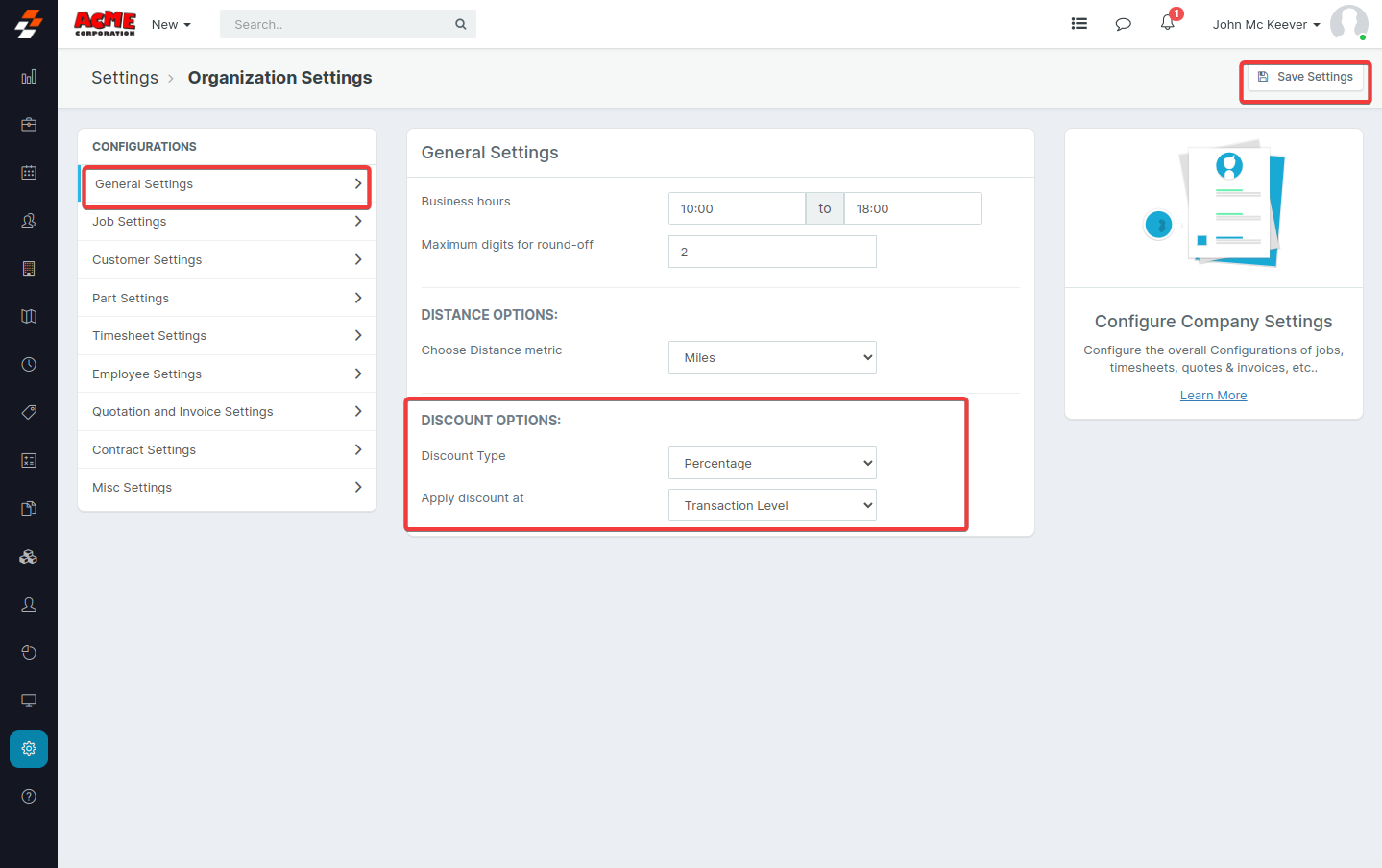Navigation: Settings --> General Settings --> Accounting Settings --> General Settings --> Discount Options 2. Under the “Configurations,” select “General Settings,” and you can set the Discount from the “Discount Options.”