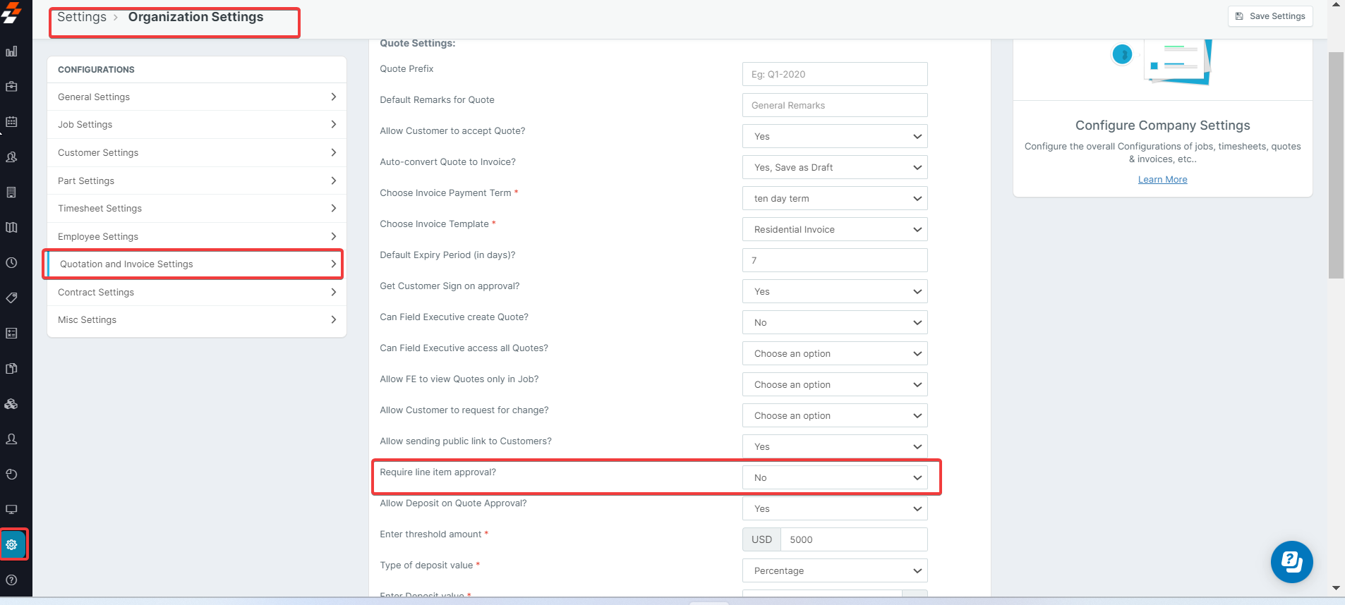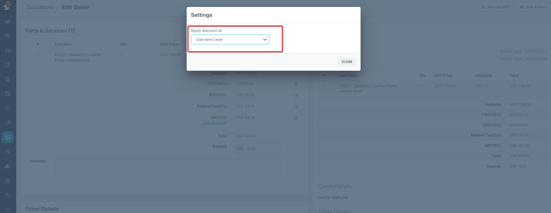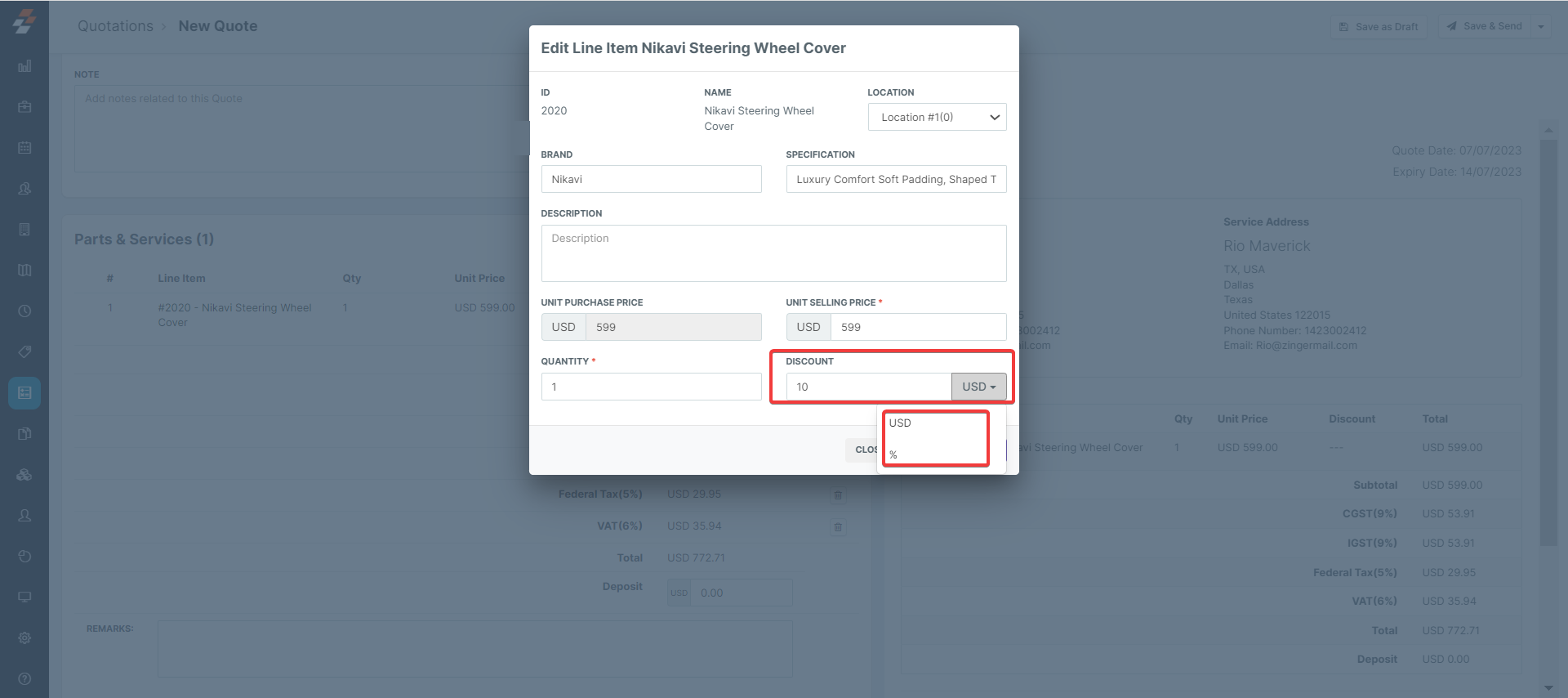 You need to pre-define the discount and fees under the parts and services. The pre-defined discount and fees can be added during the Quote and invoice creation. The discount is based on the transaction level or overall billing of the parts and services based on the minimum or maximum value set. The fee is usually the transaction fee applicable for the product.
