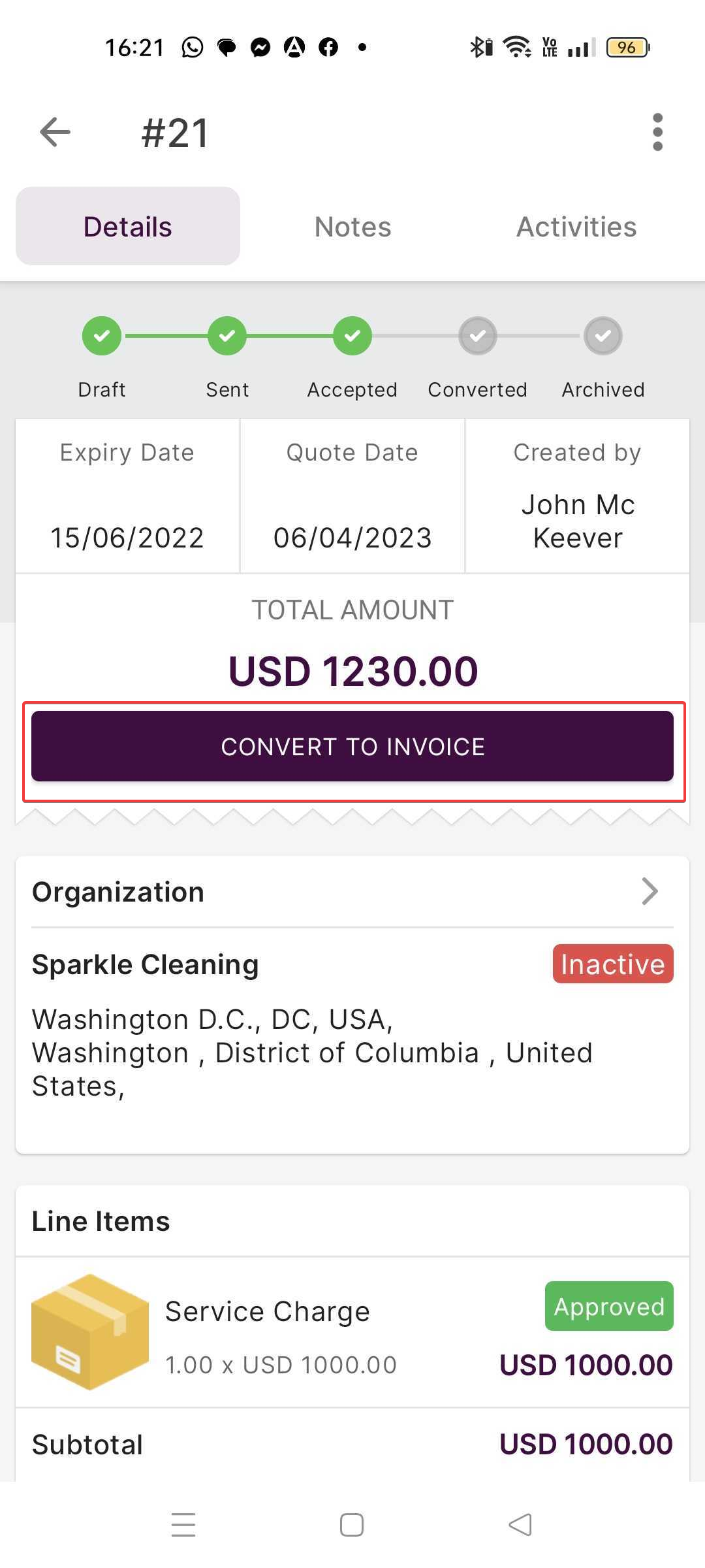 3. Select the "Convert to Invoice" button to create a new invoice based on the Quote created.
