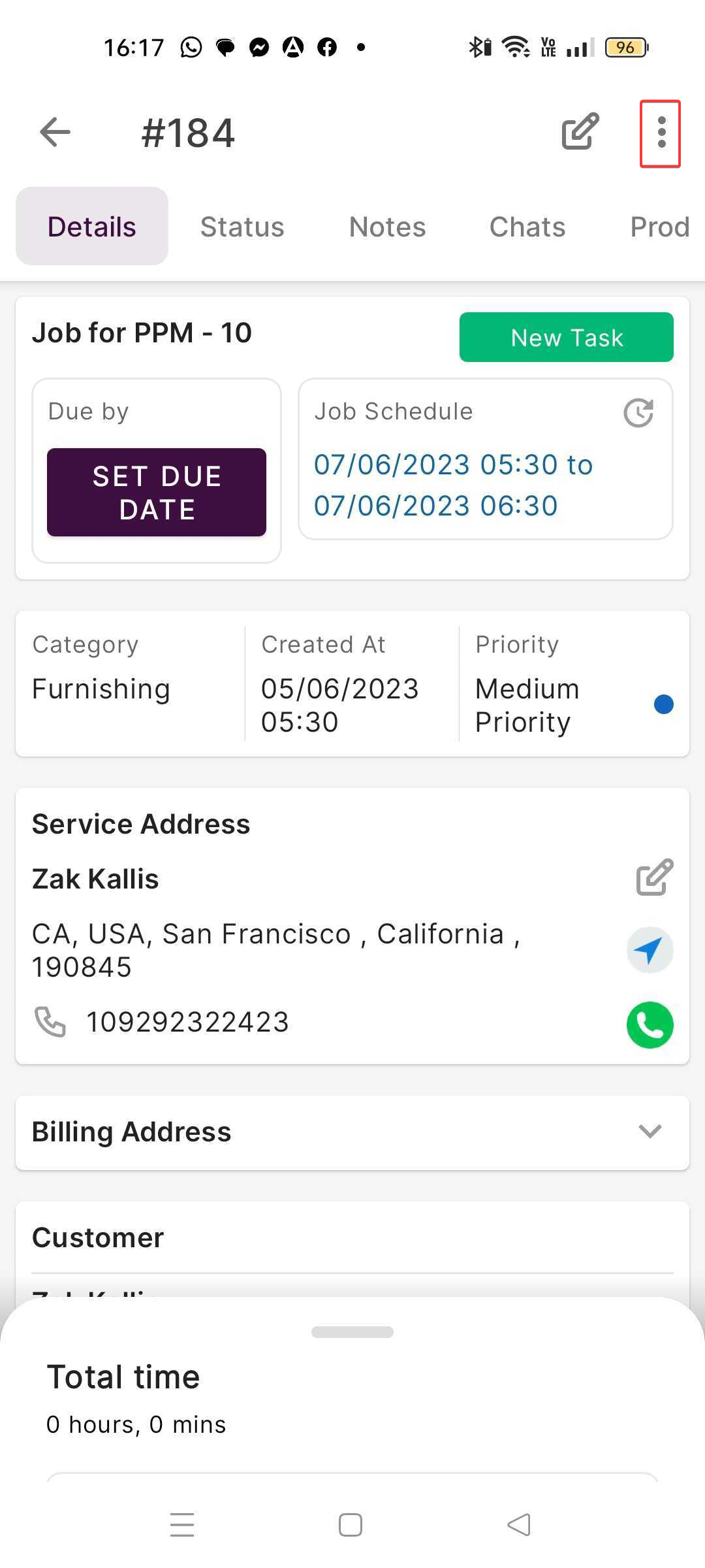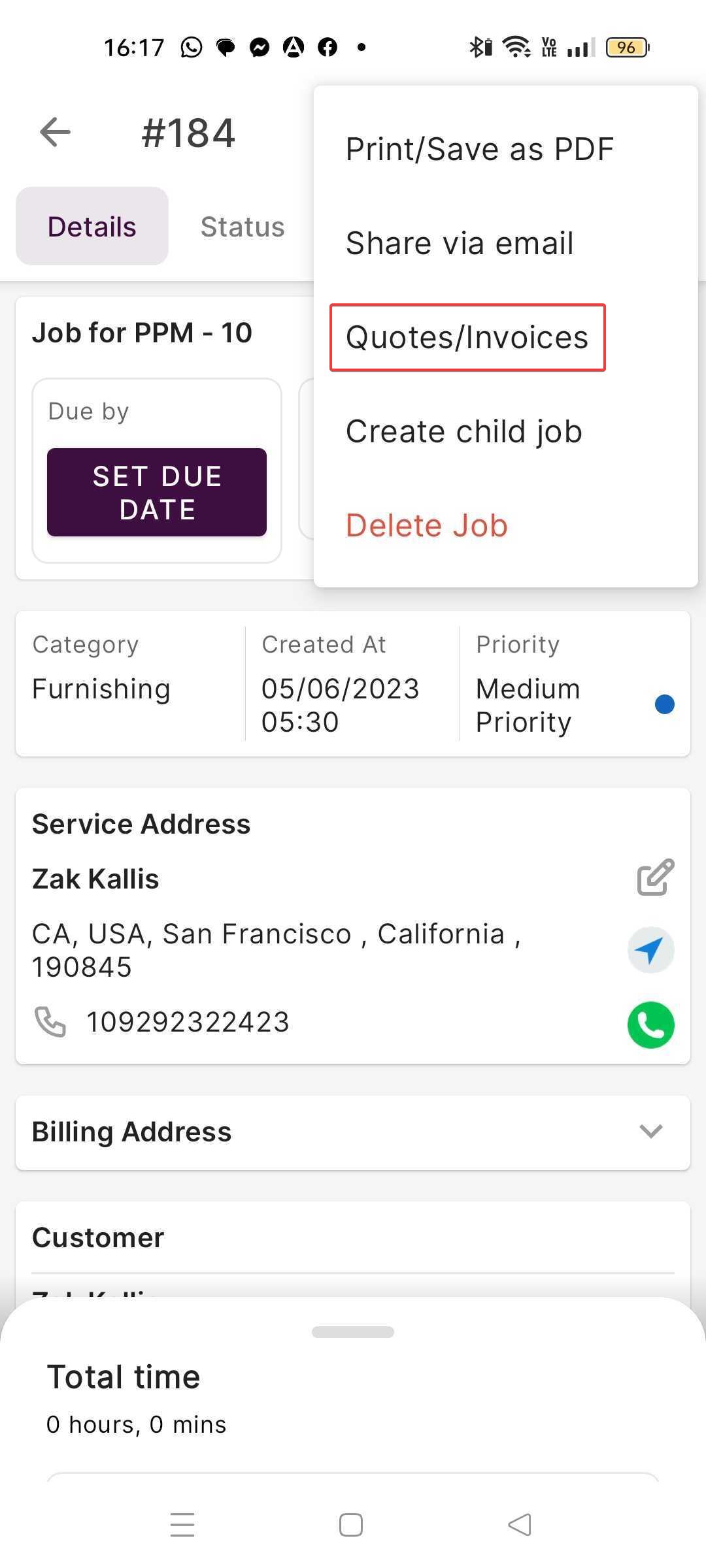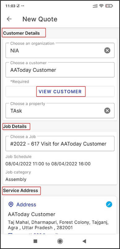 All the customer details and job details were pre-filled based on the Job selected.
