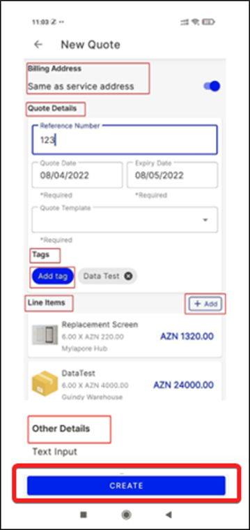 Finally, select the "Create" button to create the quote.