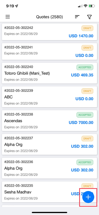 from the bottom-right corner to create a new Quote.
