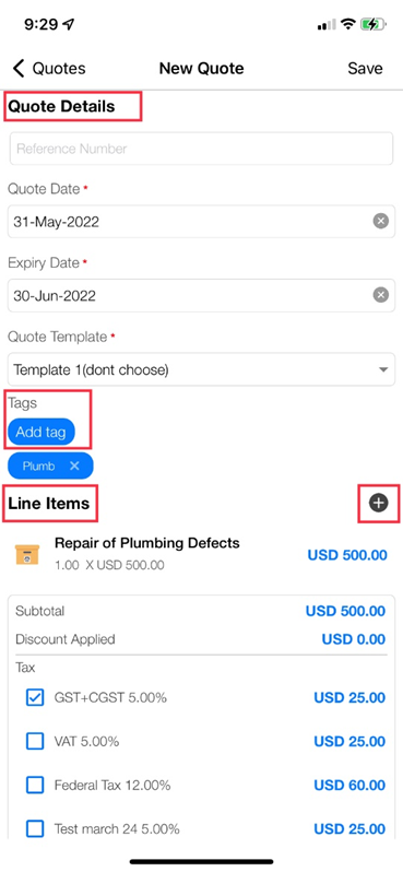 option to add the reference number, quote date, and expiry date, and choose the