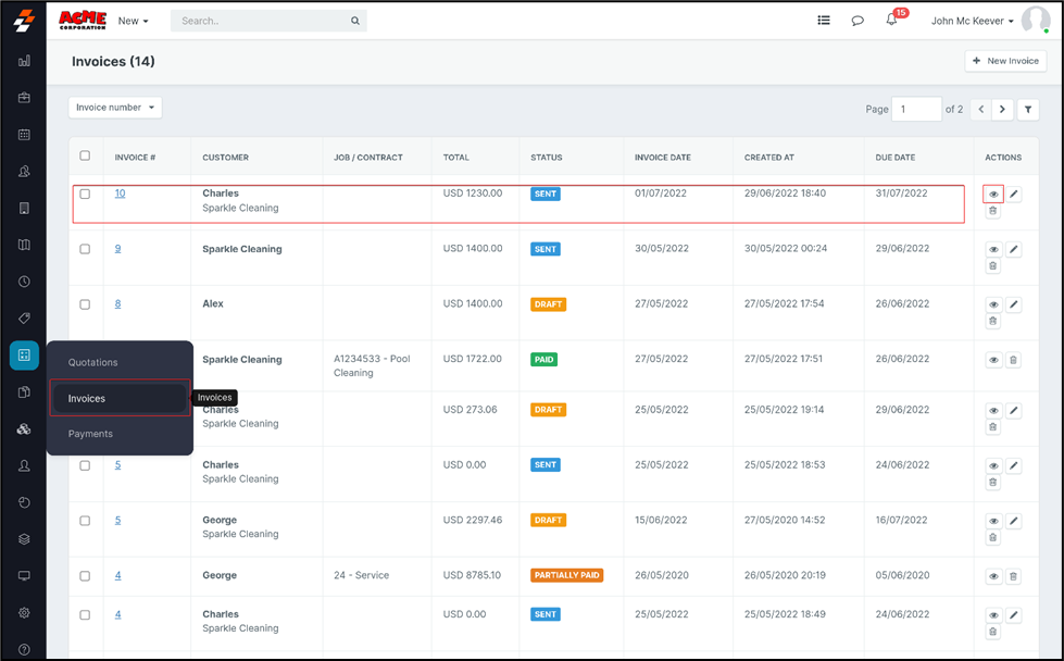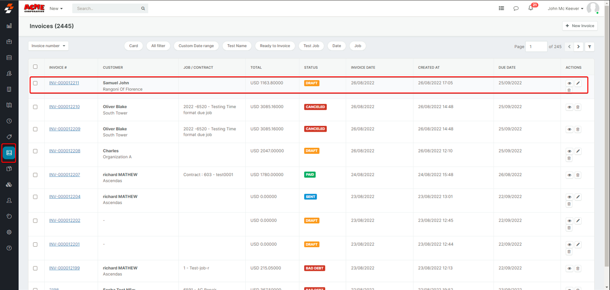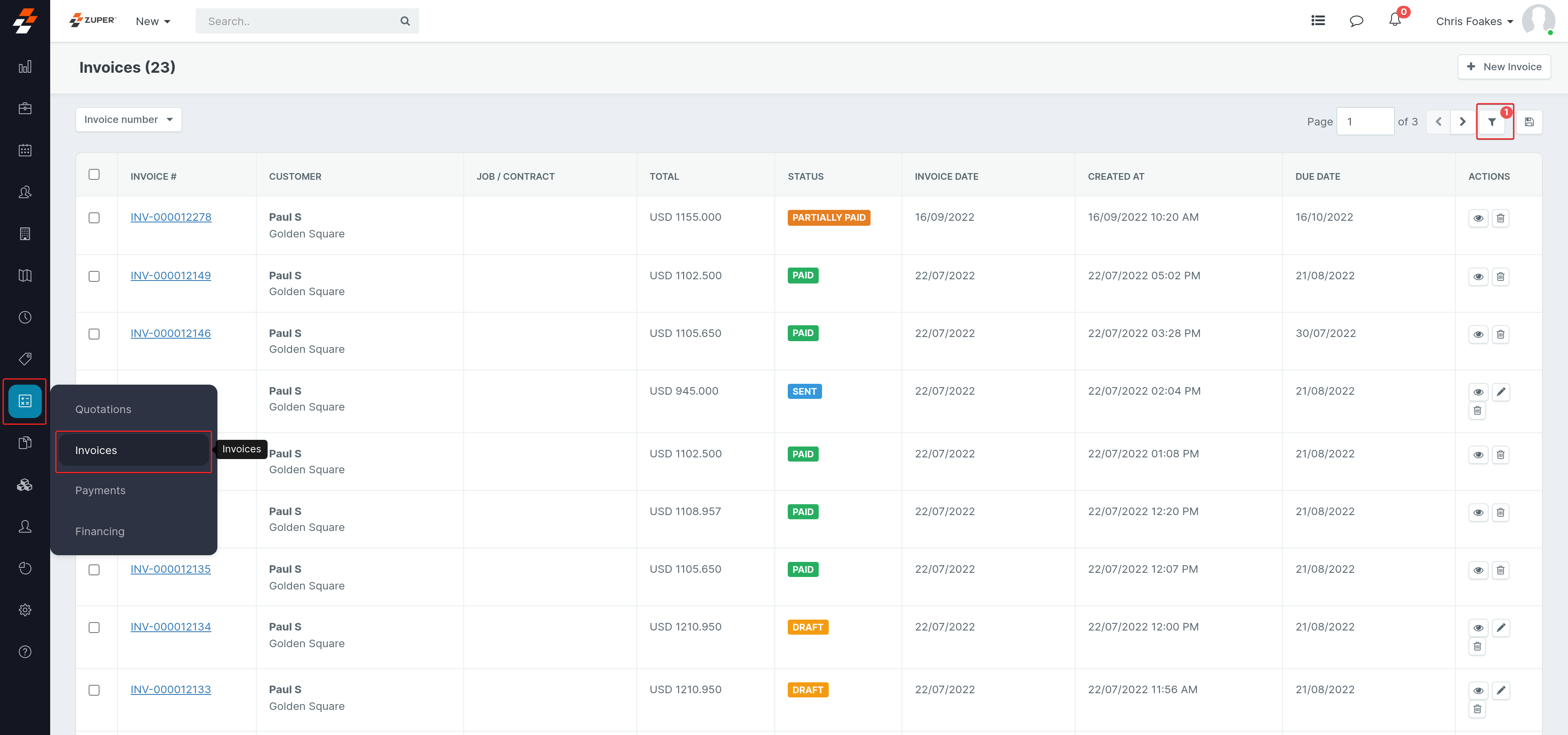 - Go to the Invoices Listing Page by clicking the 'Invoice' Module in the Menu.